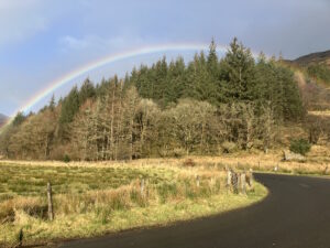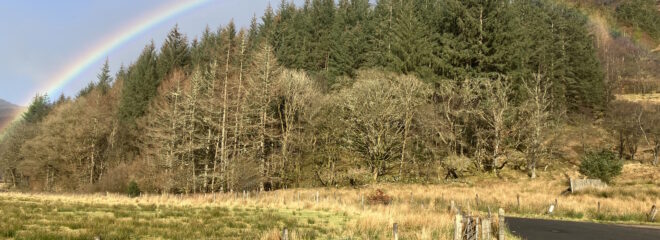 R and I walked out to Drimsynie Beg this afternoon. It was sunny and raining at the same time in true Argyll style, and we saw a fantastic rainbow.