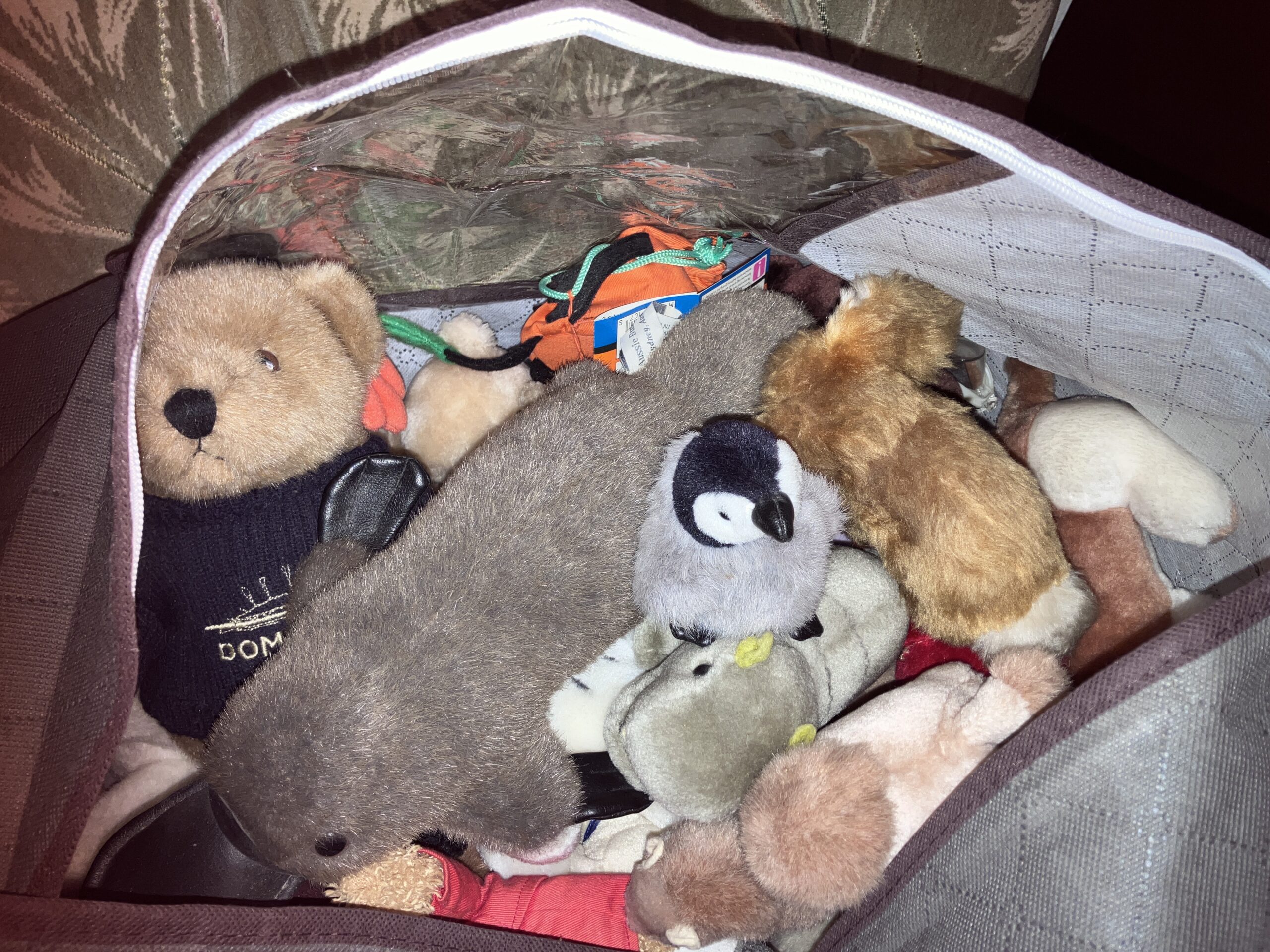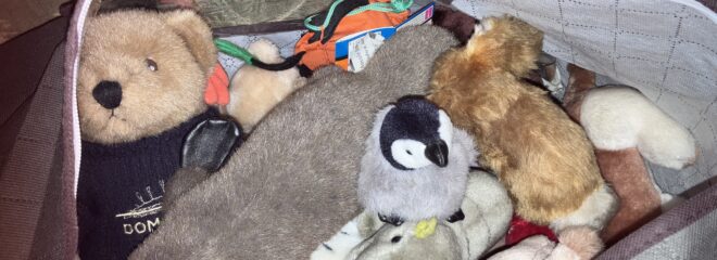 J has a big collection of soft toys. Mostly people have given him over the years, but part of his family is a “zoo” which he bought himself when working for a games shop over thirty years ago. There are ten or so different animals:- elephant, zebra, tiger etc Now he is clearing his flat out ready to move, and the zoo was duly packed in a bag to be stored with R and I temporarily.
