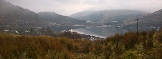 Coming back through the village we were barked at by two dogs in gardens and also said hello to a nice red setter who we sometimes meet out walking with his owner. Anyway, just ahead of us as we got to the loch was a gorgeous Labrador puppy on a lead. It was extremely keen to run up and greet us, and its owner seemed equally keen to keep it close hauled in. I was just increasing my pace to catch up with it when R suddenly stopped and took a picture of the loch.