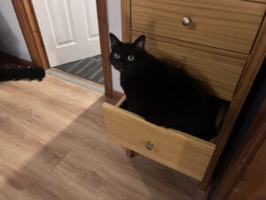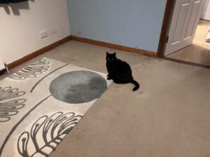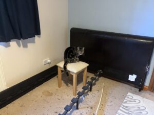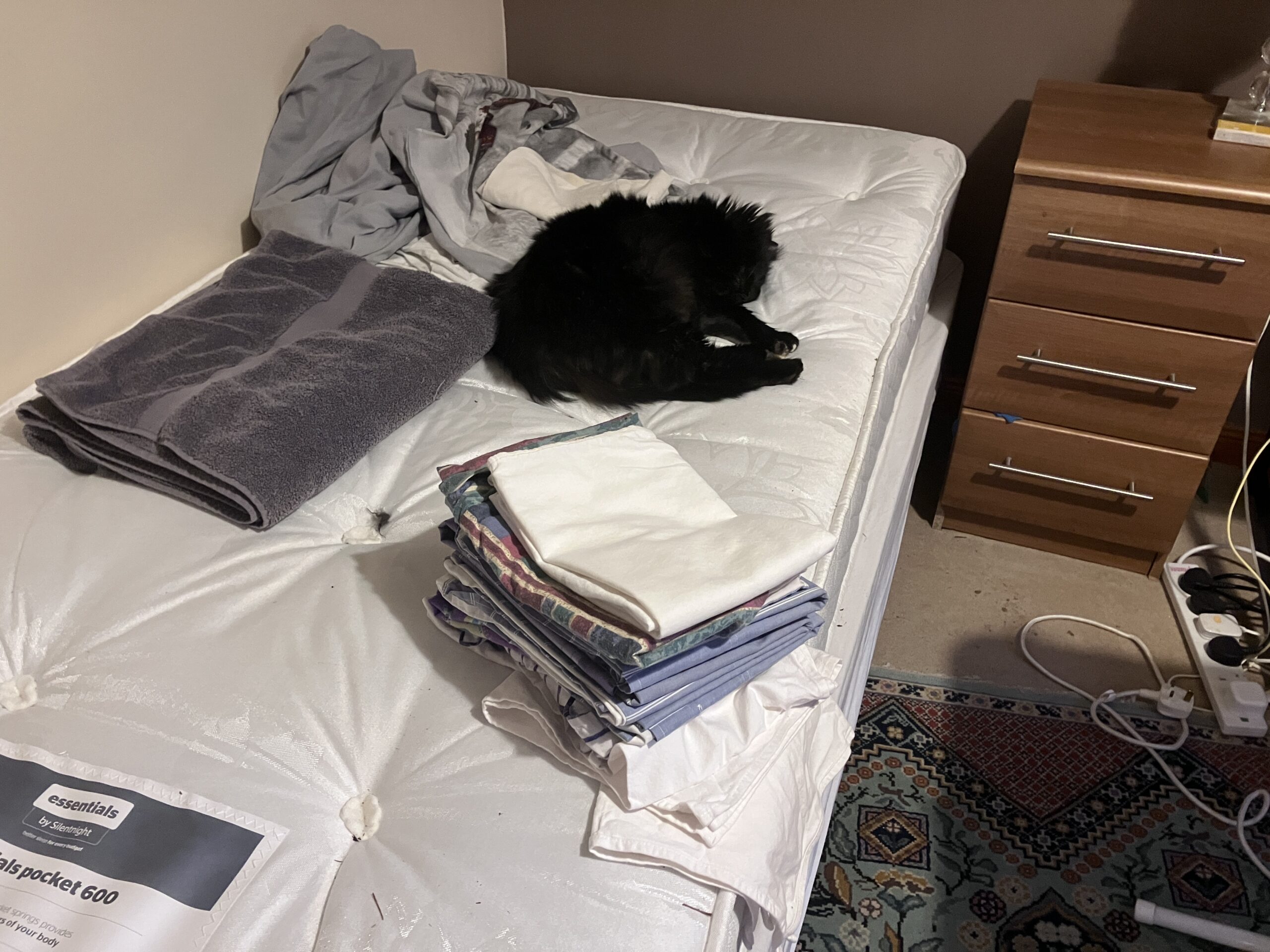 Today R got a new bed. The old one had been a Saphy project in more ways than one. Firstly she had ripped the shit out of the headboard, and secondly she had had more than one bird under there over the last year or so. Although we had managed in general to either rescue the creature or extract the corpse, it was not an easy bed to move to clean under it, so when he ordered a new one, Saphy had to assist me in cleaning up the hundreds of feathers underneath the old one. Note also the strange stain which I think is cat related too.
