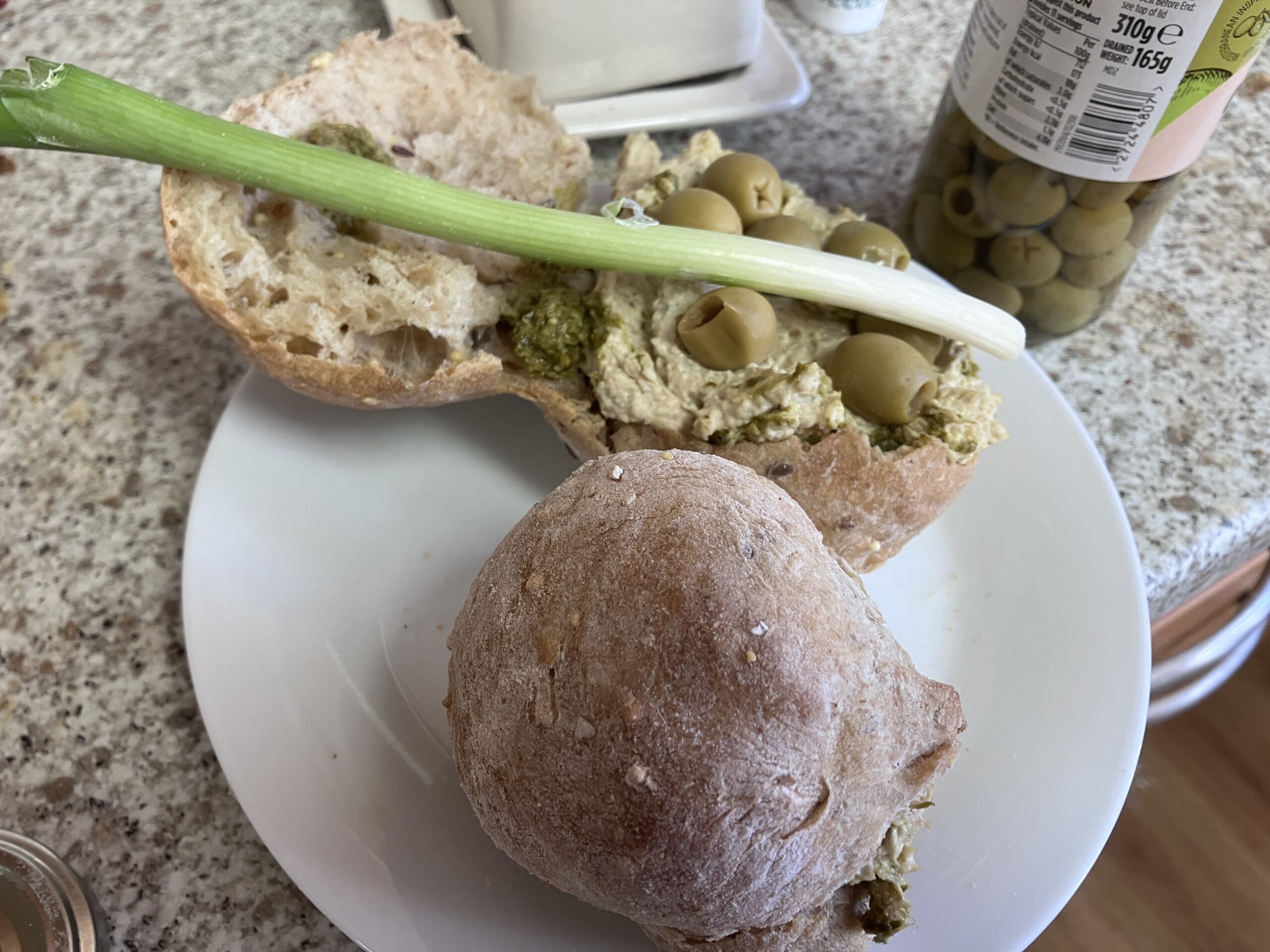 Homemade “8 grain flour” rolls with homemade humous, green pesto (shop bought I am afraid) and spring onions.