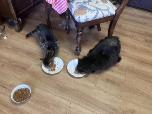 While we were eating our carnivorous sandwiches, two other carnivores were munching away as well. Now Saphy has recovered from her bladder trouble the two of them are getting on far better with each other.