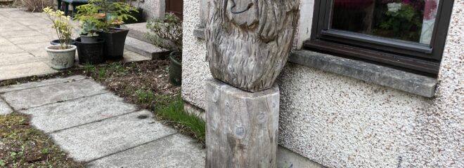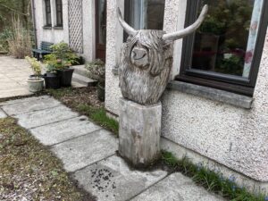 Our chainsaw sculpture coo “Heather” has acquired an extra element of authenticity, courtesy of the sheep which have now been in our garden for over a week. We are hoping they will stay.
