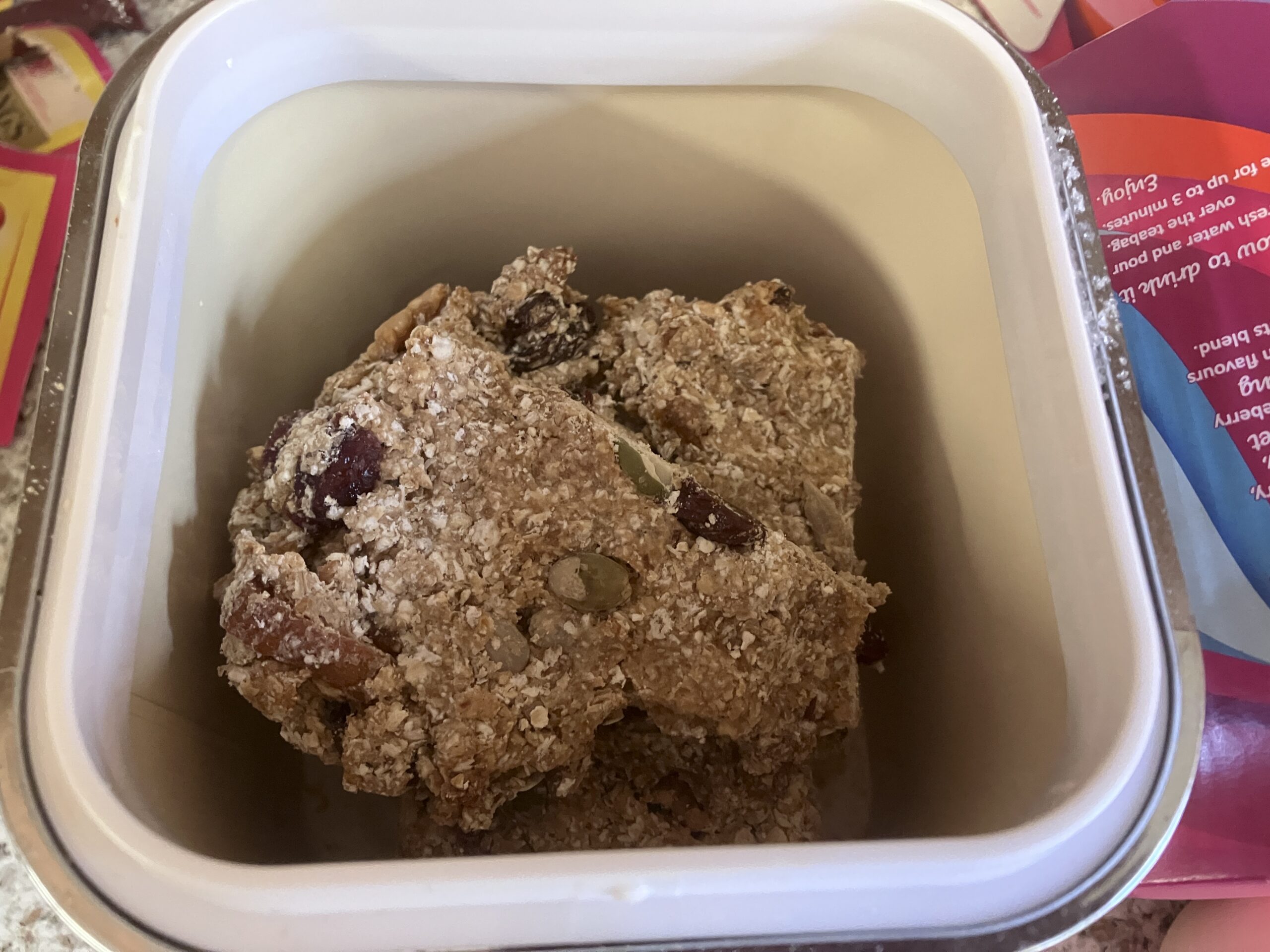 200g Quaker oats (from Cupar no less!) mixed with 150g mixed dried fruit and nuts and cinamon to taste. Add 60g smooth peanut butter, 50g of honey and a mashed medium banana. Mix together and push firmly into a lined baking tray. Cook at 160C fan for about 25 minutes or until starting to brown. Leave to cool completely and then cut into bars.