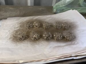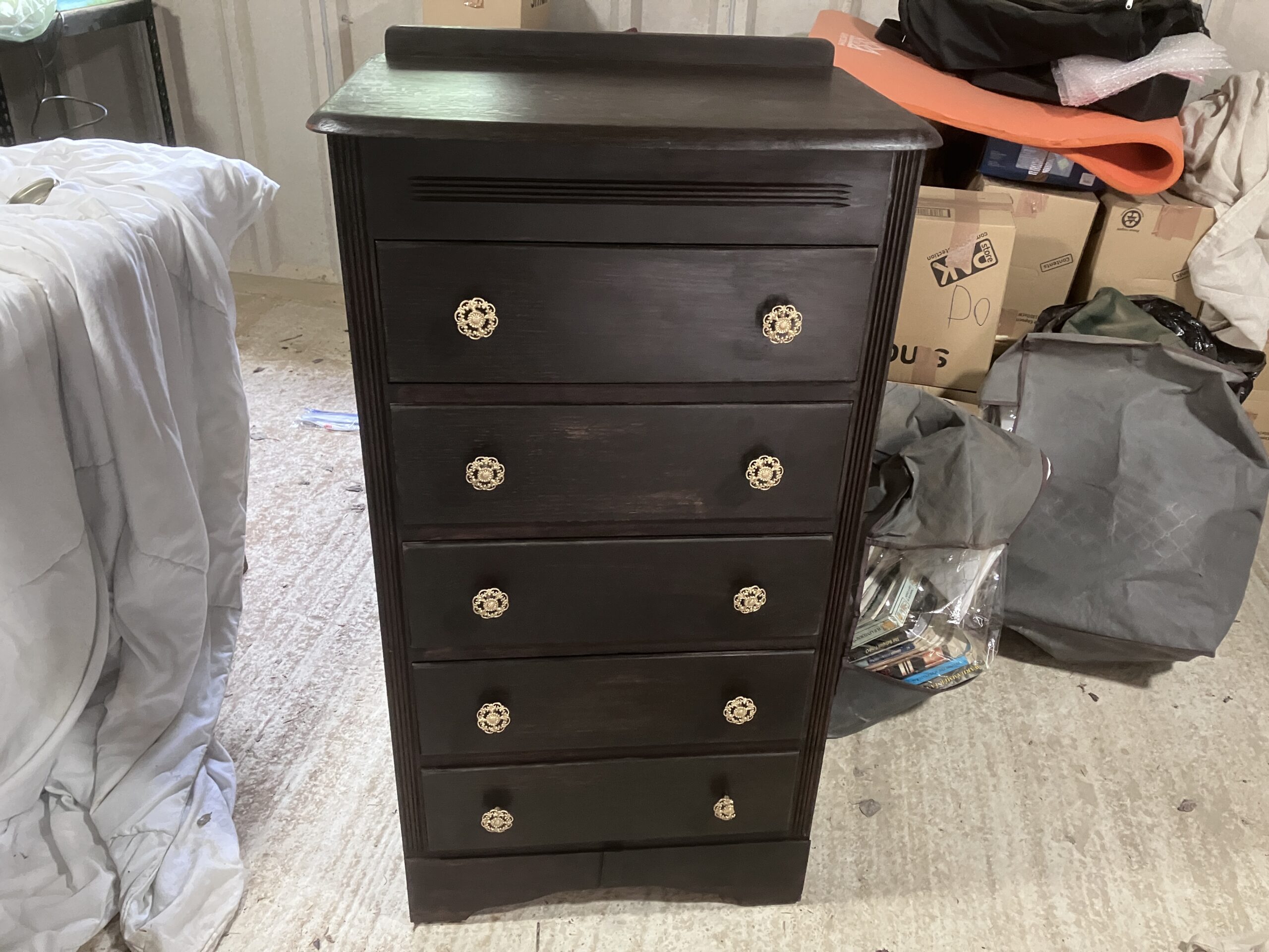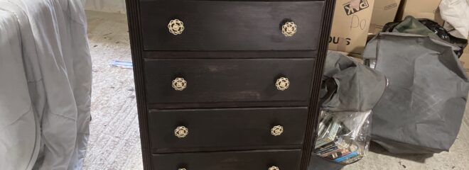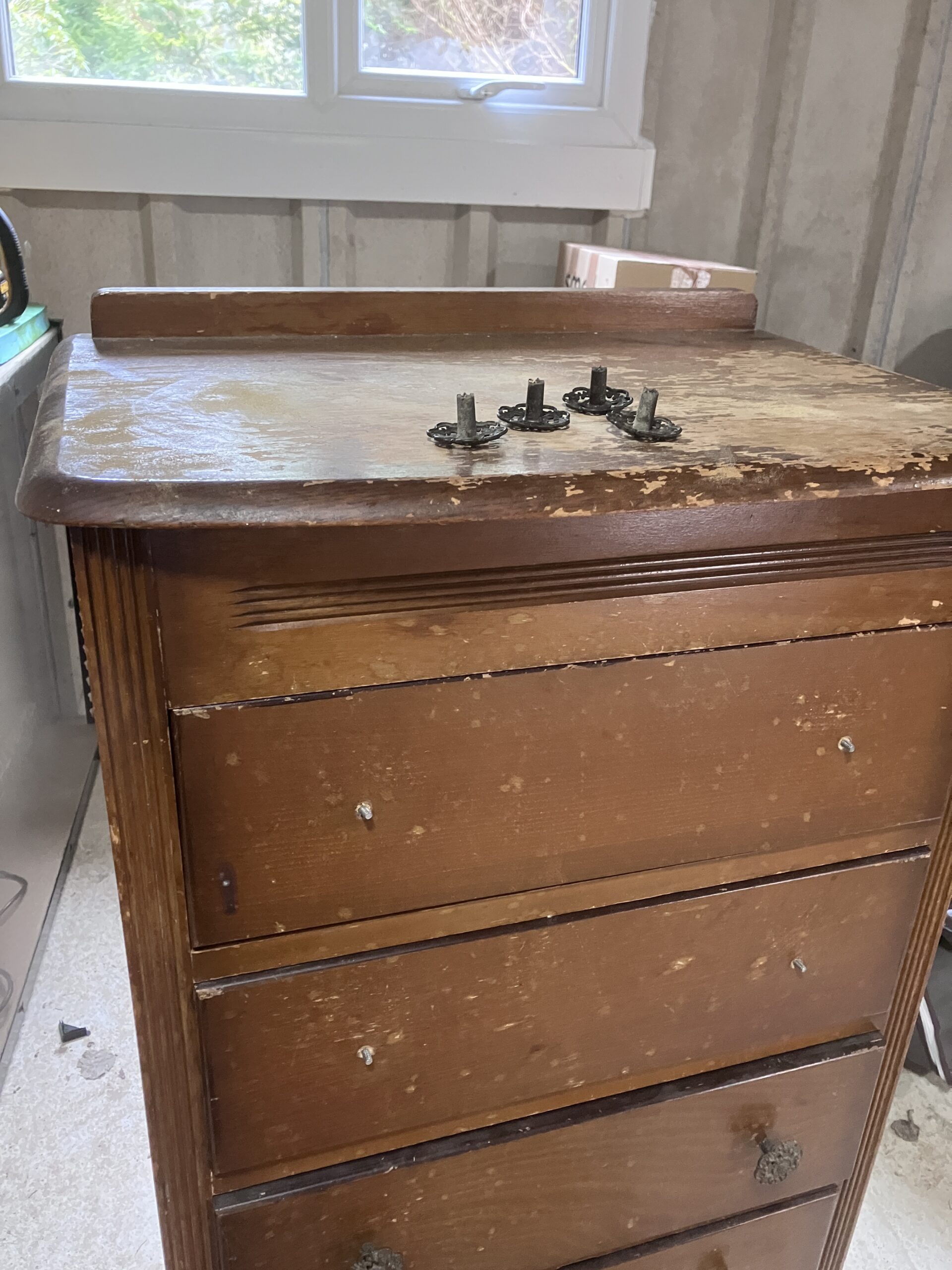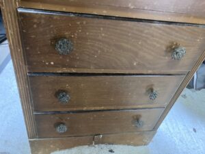 So I started with a piece of furniture we had been going to throw out – it came from my grandmother’s house. I think it is 1930s. It was very dirty, one of the legs was missing its pad, the handles had gone grey and part of one of the handles was cracked off.