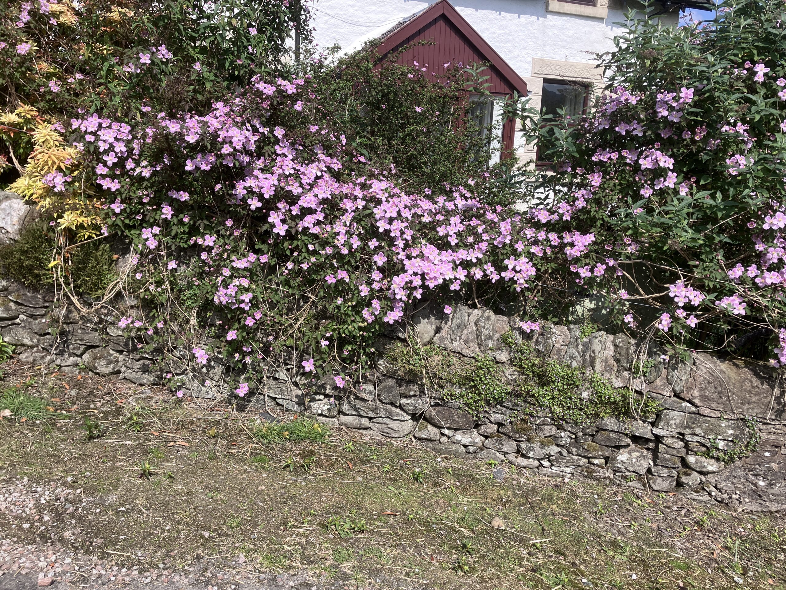 There is quite a lot of downwards descent on a very rough path which is just the kind of thing my foot is not much good at, but I did pretty well considering that this was only my second proper walk in trainers (rather than boots). The walk took us back past Lettermay house where there is a spectacular “Northern Lights” clematis.