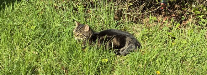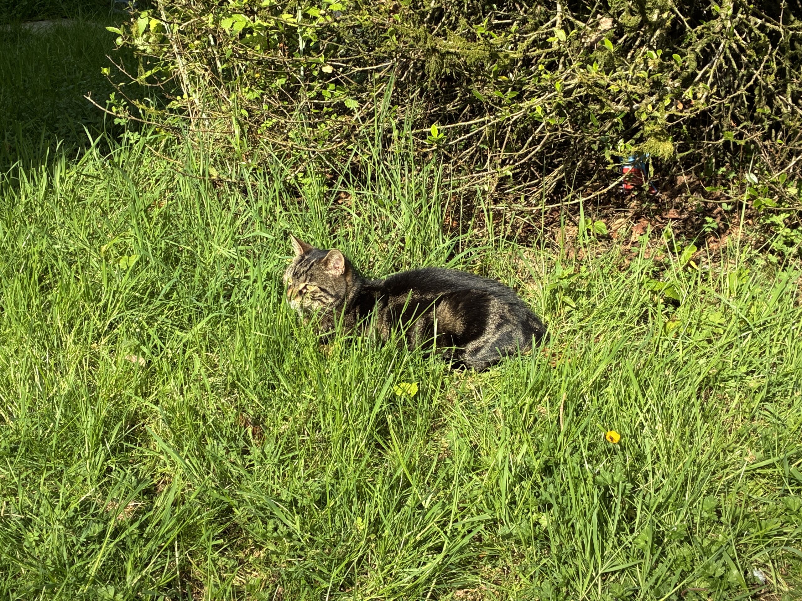 The picture is of Saphy lurking in the grass near the bird table ready to pounce.