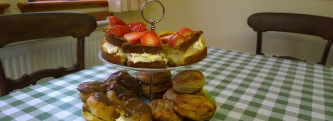 Eccles cakes, strawberry cream sponge cakes, jam tarts, chocolate éclairs.