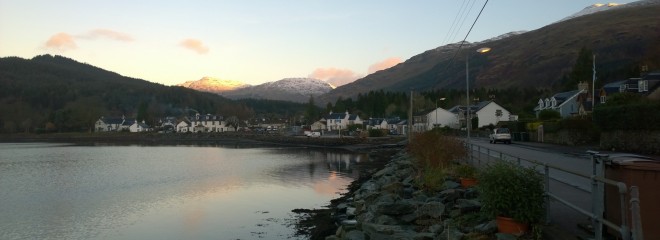 As we came back into the village the sun was just coming up over the mountains and turning them pink. I stopped to take a photo of the Goil Inn over the loch and it really looked the epitome of a traditional Highlands Inn with the smoke rising from its chimney and the snowy mountains in the background.