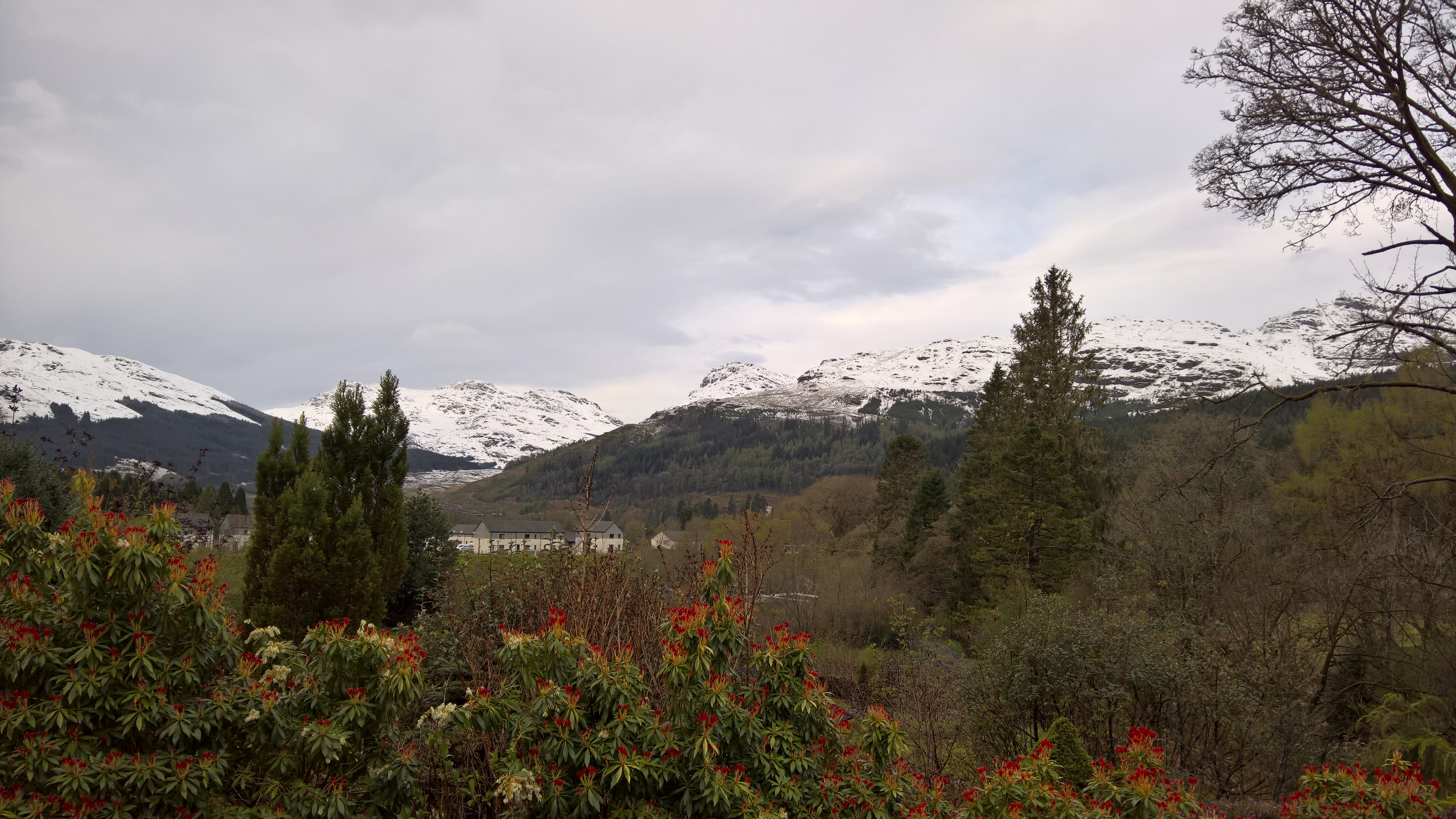 So all yesterday afternoon it was snowing heavily and almost lying – a couple of degrees colder and we would have had a thick covering – even here at near loch level. Today the mountains are white down to about 200m, and this evening the sun has come out and everything is very scenic and alp-like.