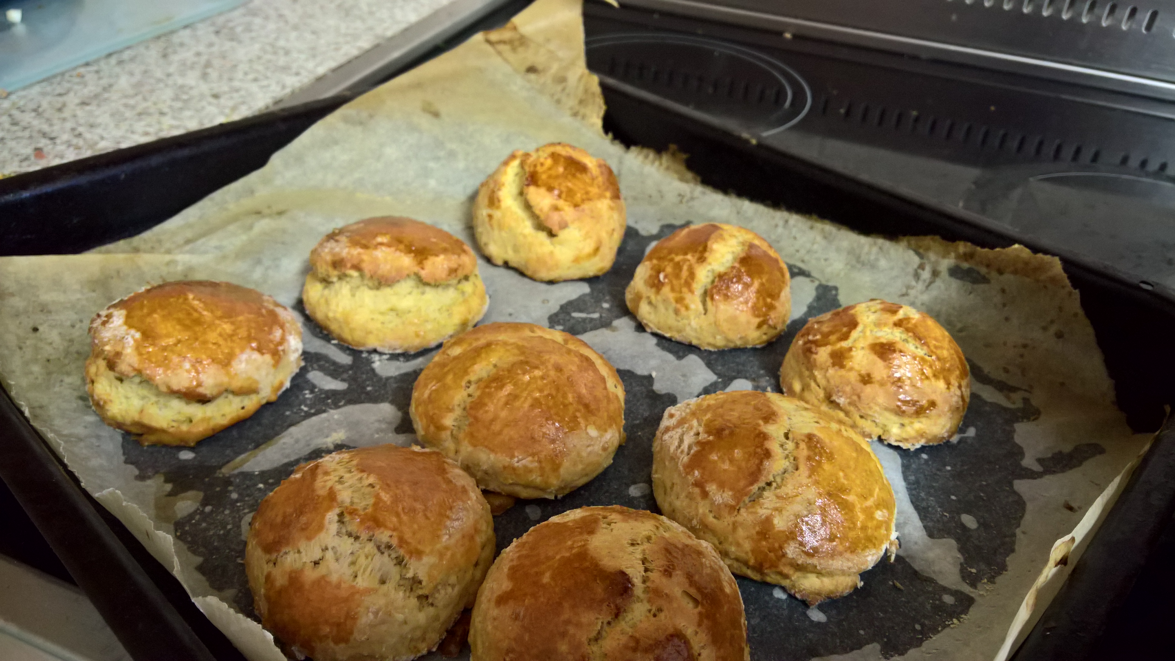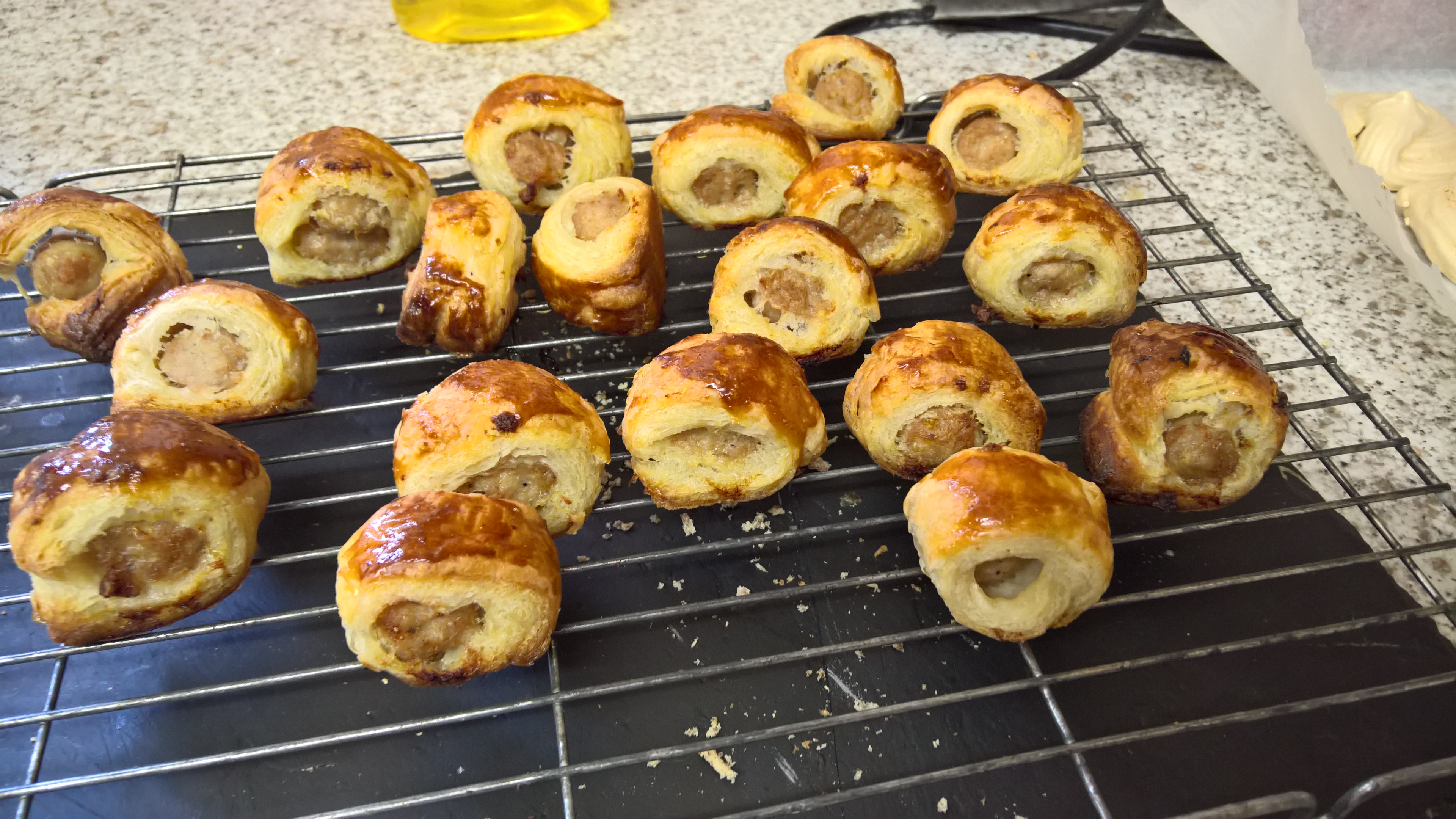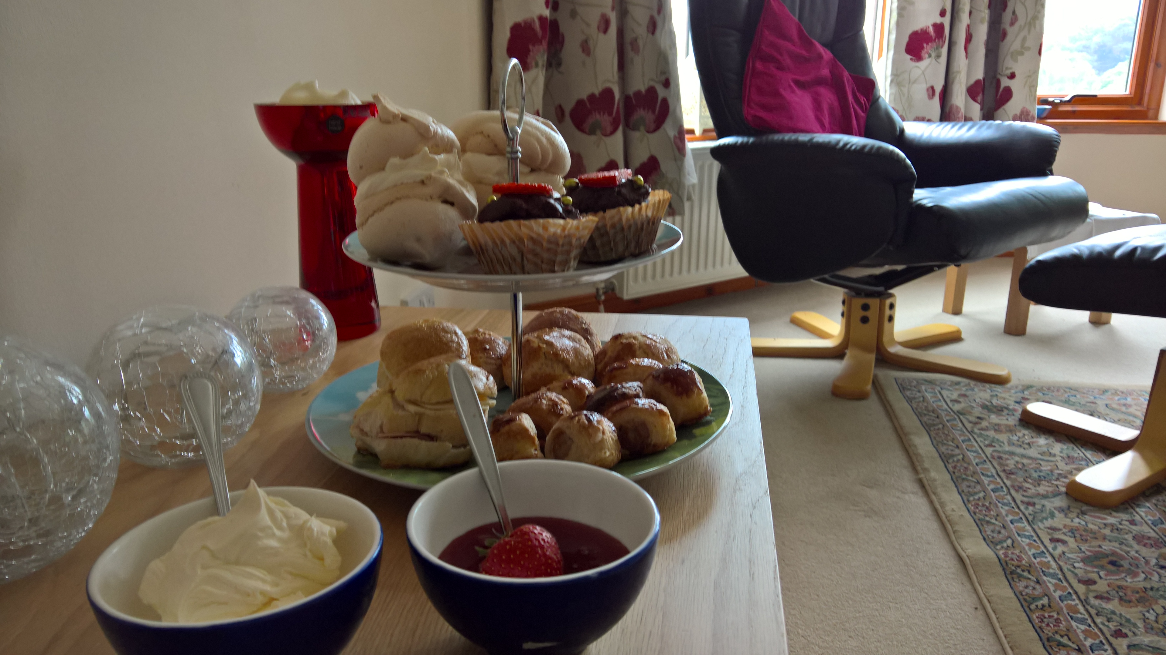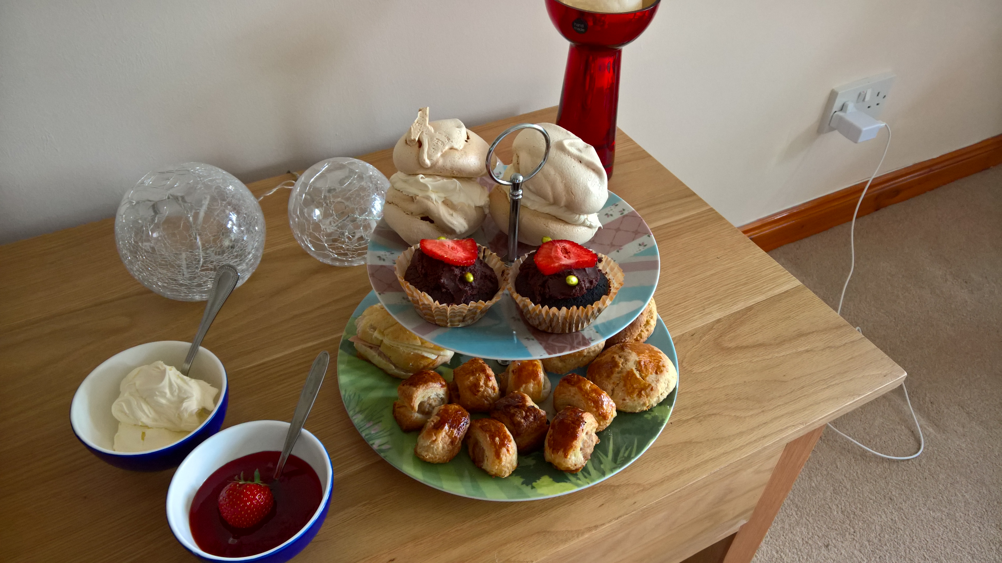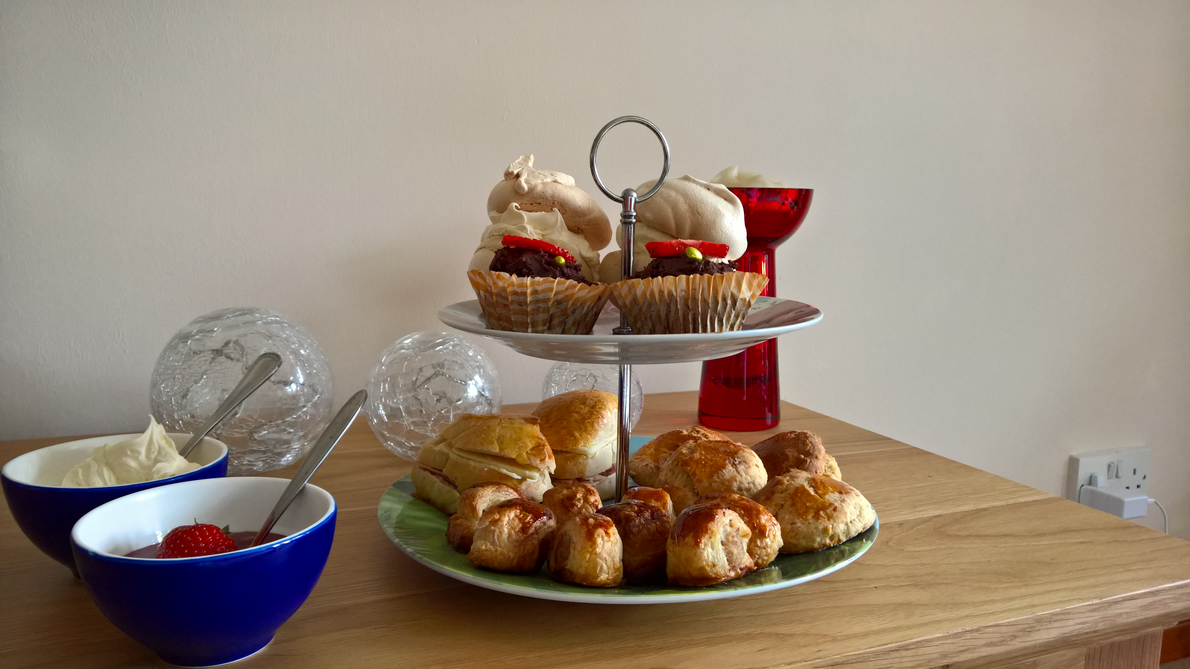 I made R the birthday treats I had promised. Sausage Rolls, cheese and ham rolls, meringues, chocolate cake and scones with strawberry jam and whipped cream. Everything was home made, including the puff pastry for the sausage rolls which for a change I made myself. I hadn’t tried this since I was a child and people had kept telling me it wasn’t worth it – but at least for rough puff, I found it easy and quite quick to make. It turned out great and I would certainly make it again because it rather goes against my grain to buy shop bought pastry (I used the BBC recipe).