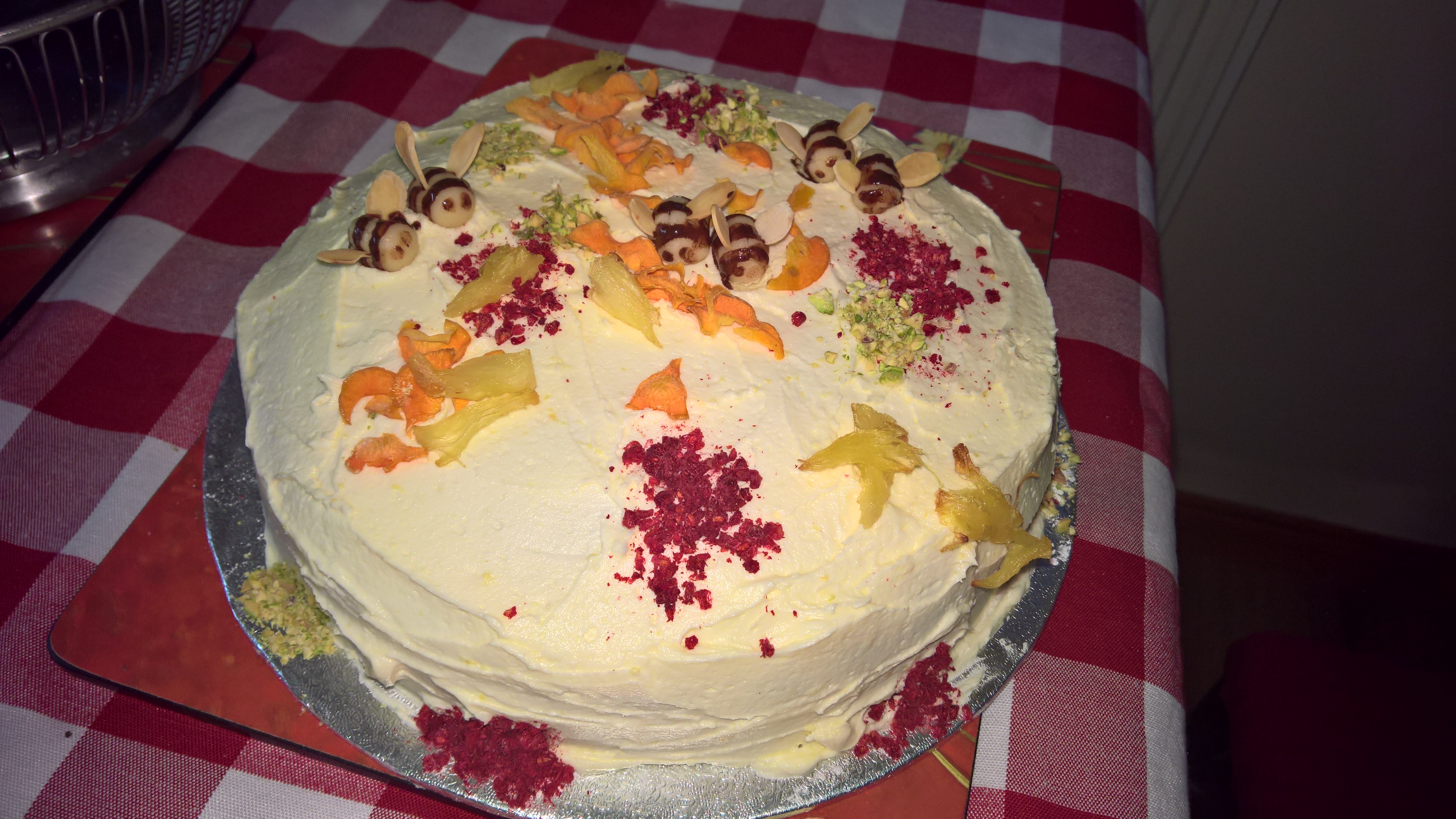 I decorated it with some of the brilliant ideas from the original cake, although I didn’t have a fresh pineapple to make the flowers with. I also had a bit of difficulty with my bees as I made them a bit small and was then rather impatient about leaving the chocolate to dry so I smudged them rather. I will do better when I make the real thing. For the icing – I covered the cake in a thin layer of marzipan and then iced with vegan lemon buttercream – frankly I don’t like this myself and I peeled it off before I sampled it. I would rather have used either a lemon curd or a mascarpone cheese frosting myself – but unfortunately not very vegan.