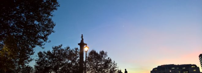 The picture is of the spectacular sunset over Trafalgar Square as we went back to our hotel.