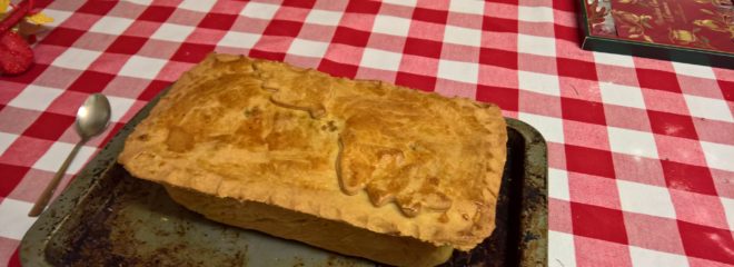 The pie was what I might describe as ‘a bit of a faff’ to make. I’d never made hot water crust pastry before, and it is odd to work with – like a sort of combination of short crust and choux but having to be worked when warm rather than keeping it cold. But it seems to have turned out very nicely – crisp and brown all over with never a soggy bottom in sight.