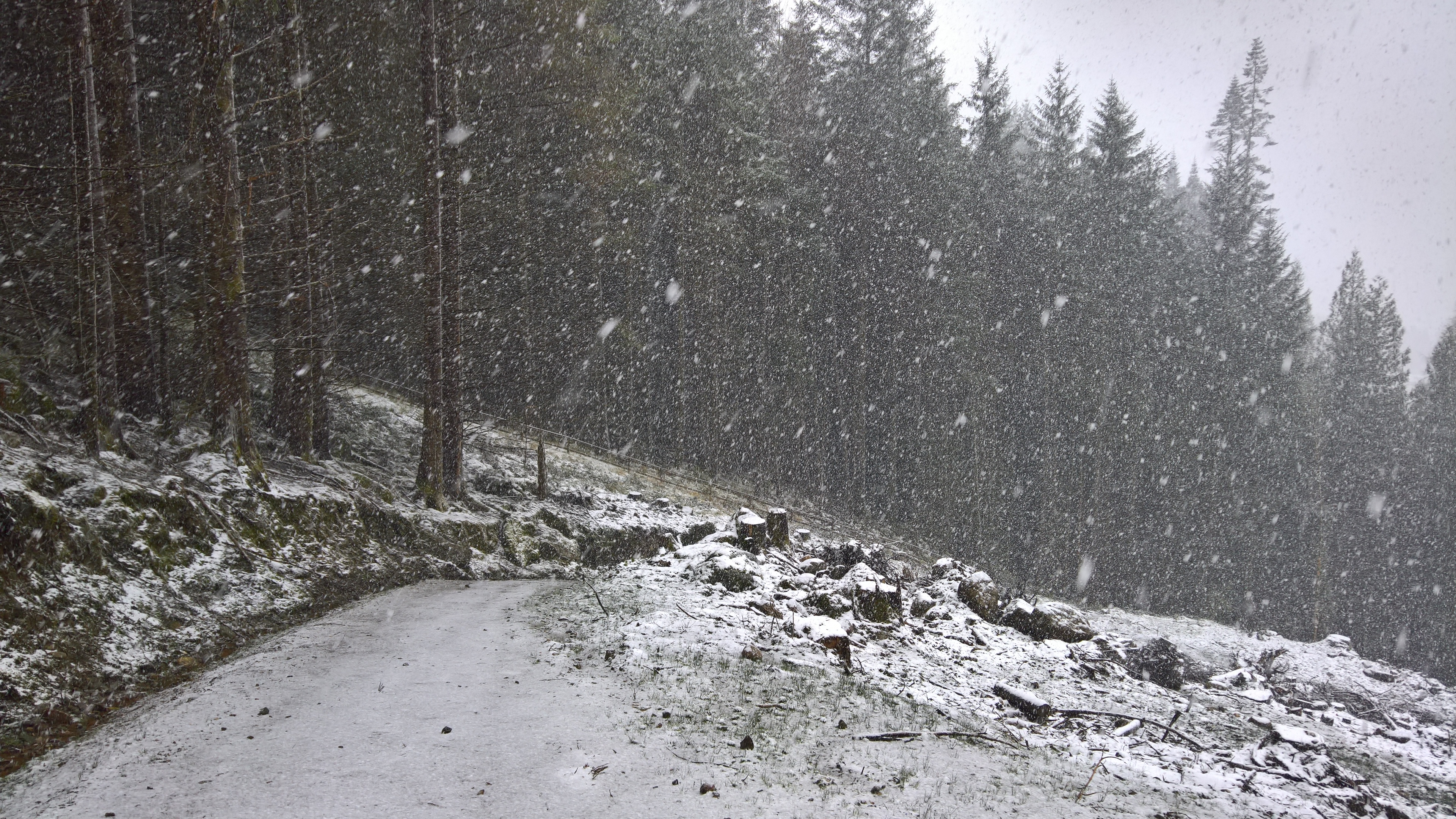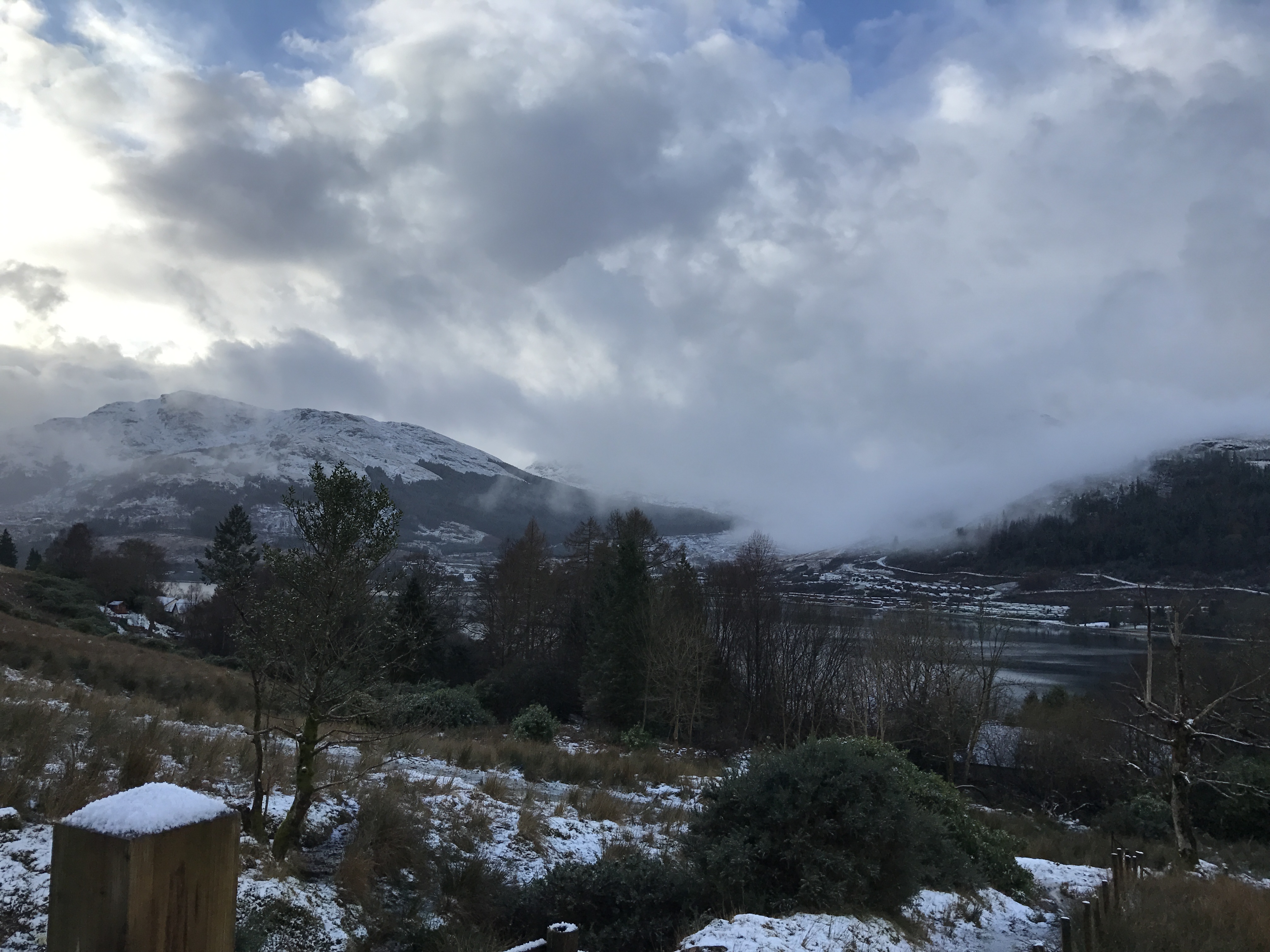 We’ve had some quite extreme weather the last couple of days. Yesterday R and I went up the waterfalls in bright sunshine, and on the way down were hit by near whiteout conditions. The waterfalls looked pretty though, and there were some nice views of billowing cloudscapes.