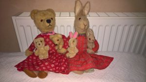 Finally, I removed their (once white) felt collars and bows and made them new ones – a pink collar for Mrs Ted and a green one for Mrs Bun. They also got new tartan bows (believe me these were a pain to make). I also mended Mrs Bun’s unmentionables (pantaloons) and Baby Bun’s tail. Apart from being a bit threadbare they are now as good as new and can join the other toys on the spare room beds. While I was at it, I also repaired the ears of another little rabbit I found in the same box – I don’t remember his name (or the one of the teddy that was with him), but they were obviously well-loved as the ears of the rabbit had been very inexpertly patched by me aged about eight.