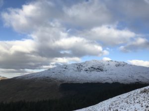 About two thirds of the way up to the bealach between Cnoc Coinnich and the Brack we hit the snowline and it started to get very icy and slippy (at this point we saw a lovely fox crossing the path not far above us). Then we crossed out of the trees and on to the hillside and all of a sudden we were in very wintery conditions and the wind hit us like a steel blade. At this point with the wind at about 35 mph we decided that rather than climb the mountain we would just cross the pass (which is about 520m at its highest) and then walk home via Artgartan and the Rest and be Thankful.