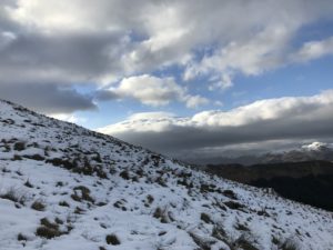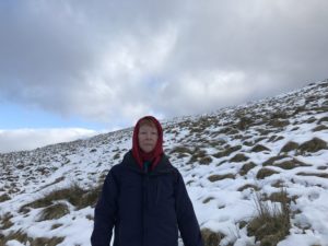 We climbed higher and the wind grew stronger and colder – even so I was enjoying myself at this point. Suddenly we came over a ridge near the high point of the bealach and the full force of the wind hit us. R who was going first was nearly blown off his feet and the snow and ice drove straight into our faces. As though as one, we simultaneously made the decision to turn back.