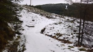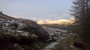 I can’t make up my mind whether spring is here or not. Thick snow all over the mountains from about 200m today and going up the path to Beinn Donich the snow was so thick on the path that I wished I had put my new crampons on because it was seriously slippy.