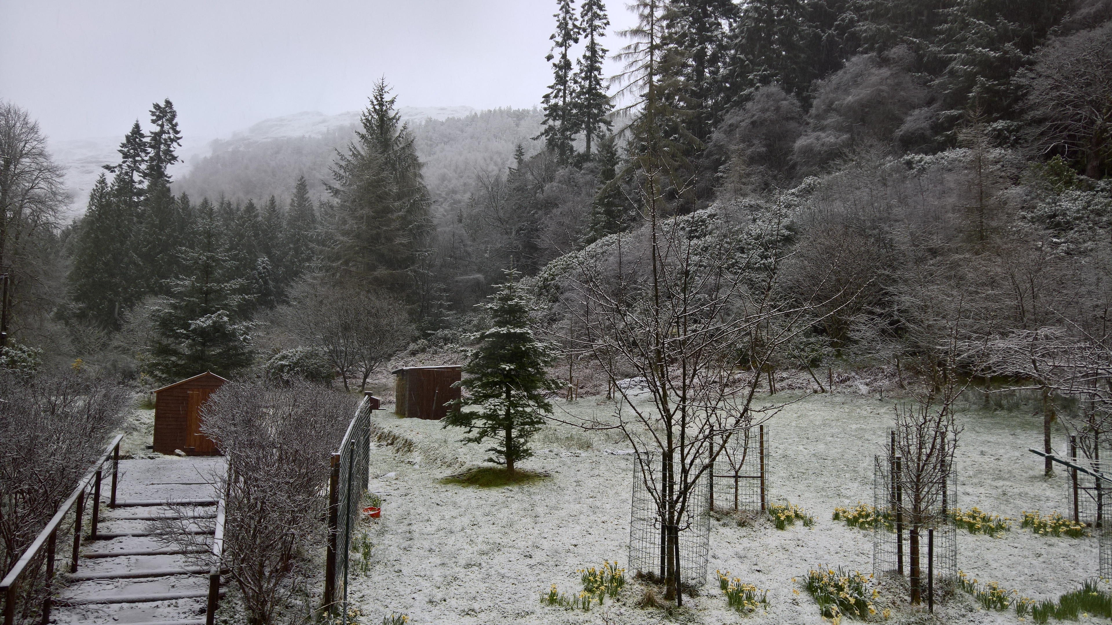 The day before yesterday I was saying to R that the last of the snow was gone off the mountains here for the year. How wrong could I be, because today it was back with a vengeance. Down here at loch level it was only just cold enough to lie a bit in the back garden, but on Bheula and Donich it was white from around 300m.