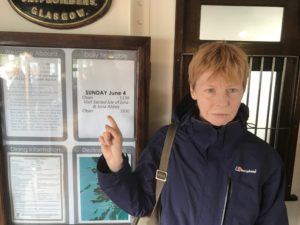 The weather in the photos looks better than it actually was. On the right there is me pointing at the cancelled itinerary for Iona and looking disappointed.