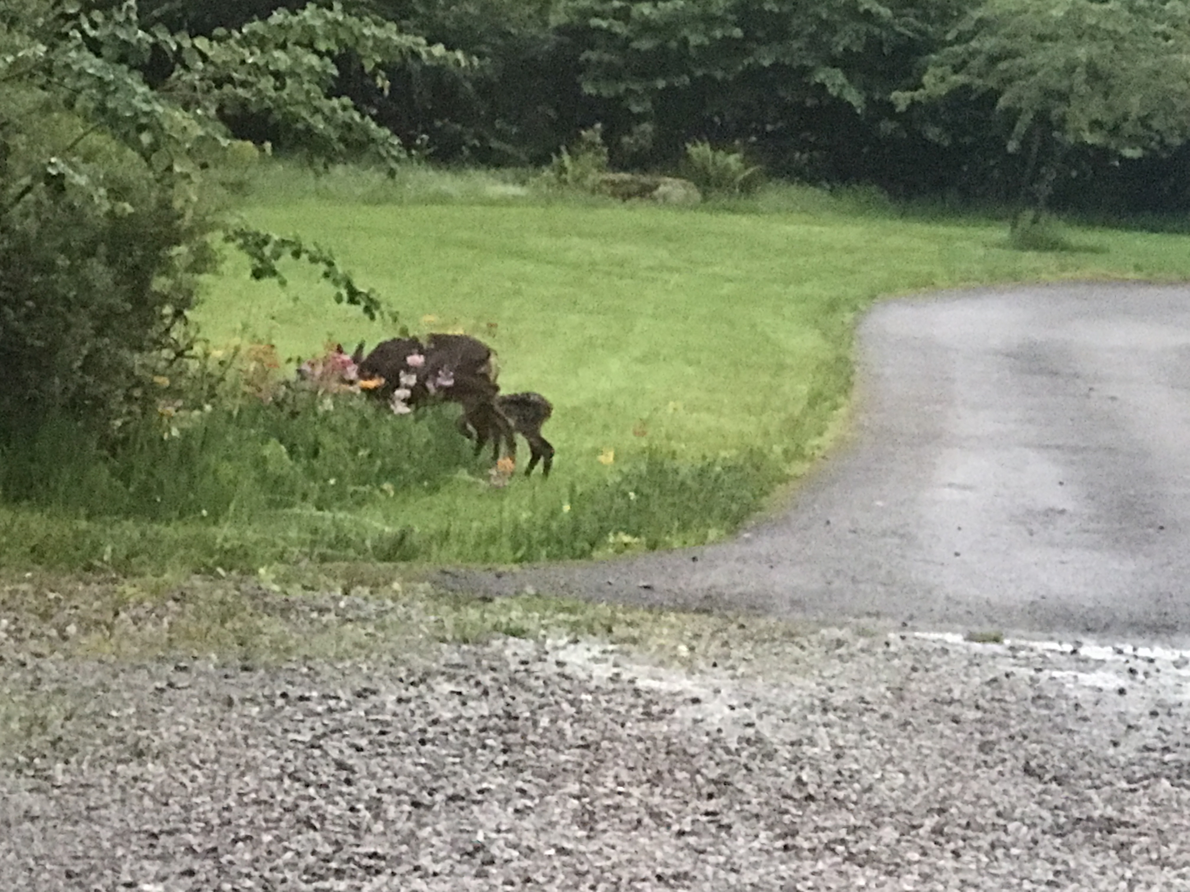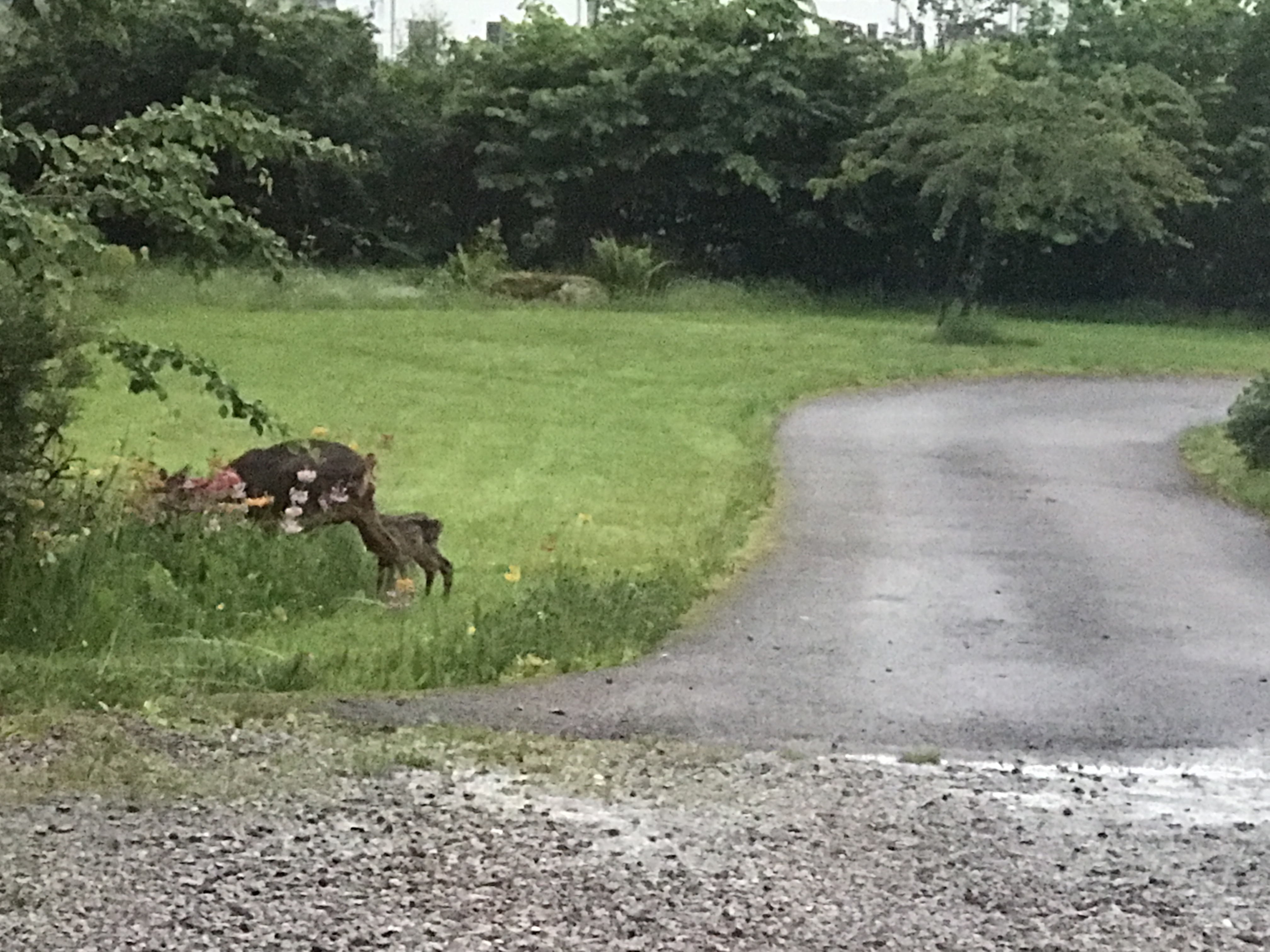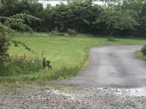 I was sitting in my office about 9:30pm yesterday – when I saw our little roe deer doe down by the candlestick primulas (she is very fond of these, in the eating sense rather than the aesthetic one). Suddenly she was followed by a tiny fawn. It may well just have been born that day as it was very small, but it was very lively and bouncing about (obviously bothered by the awful midgies).