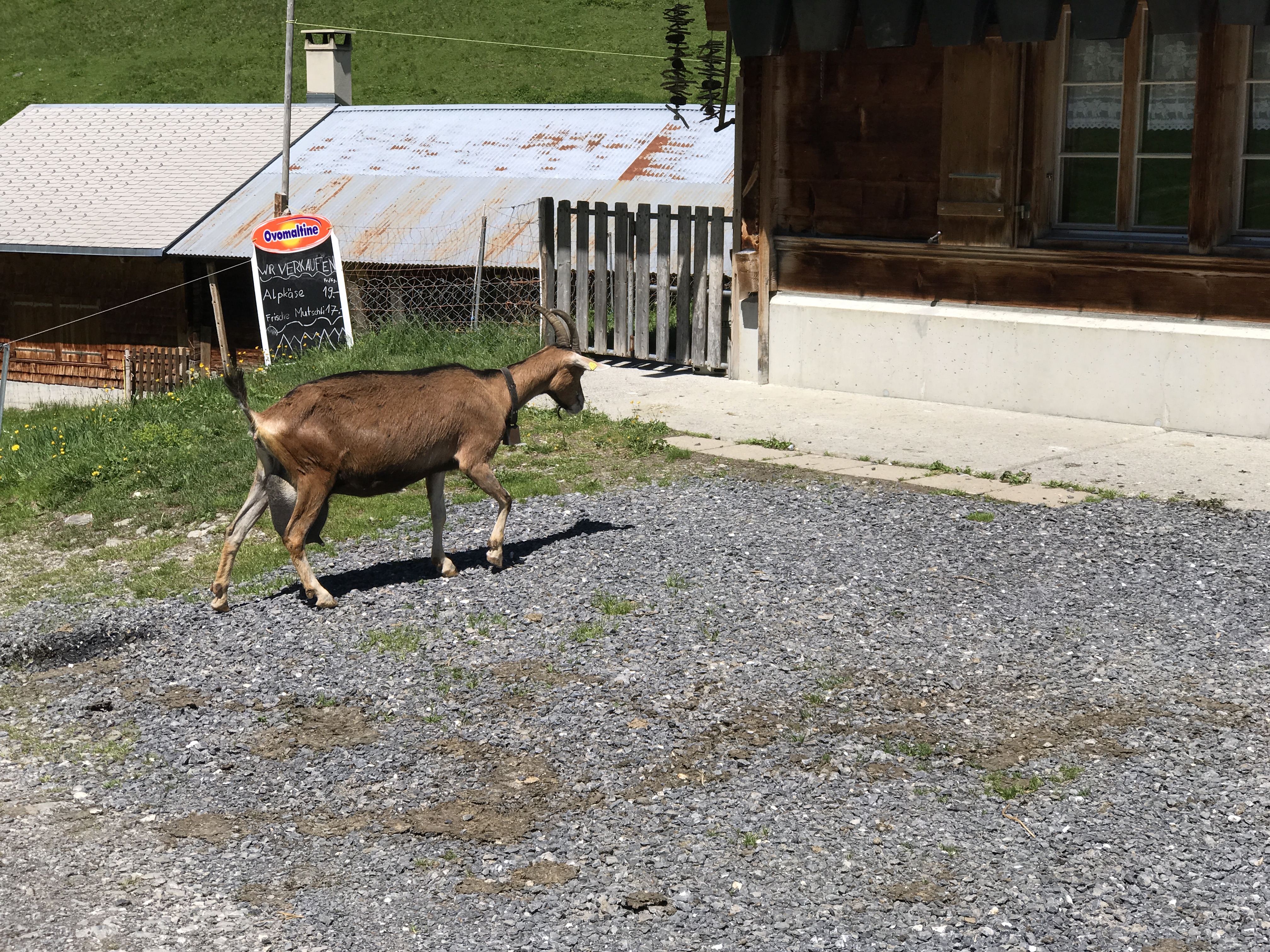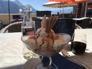 Starting in a true mountain environment (complete with patches of snow) at 2500m, we walked across meadows bright with flowers, through fields of cows and goats wearing the obligatory bells (one friendly goat had a nibble at my fingers), down through woods and charming villages to the lowest cable car station where we had Peach Melbas on the terrace of the Panaramio Hotel.