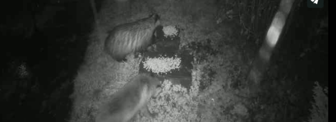 I thought our poor little fox had been driven off by the fact that all the nuts had been eaten by badgers by 9pm every evening at the moment – but last night he was back and had a close encounter with one of the badgers. Click the picture to see the video