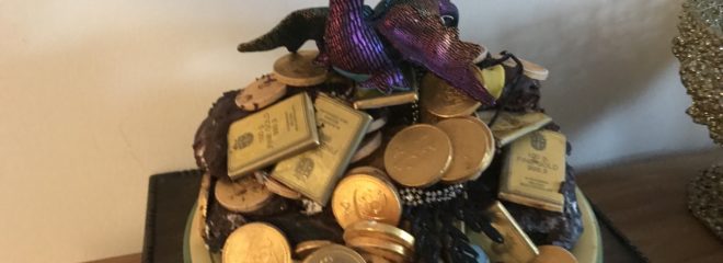 I had a little medieval theme going and this was my “dragon hoard” cake. I may have overdone the decoration a bit as J said it looked like a hoard but not like a cake!