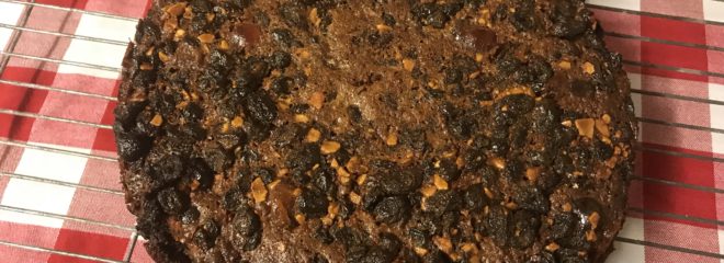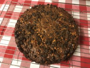 I cooked the cakes for just under four hours (the recipe said 4 to 4.5 but my oven is a hot one) and they have come out beautifully (or at least they look nice – hope they will taste good too). Now they will be wrapped in foil and ‘fed’ with brandy for a few weeks until it is time to coat in marzipan.