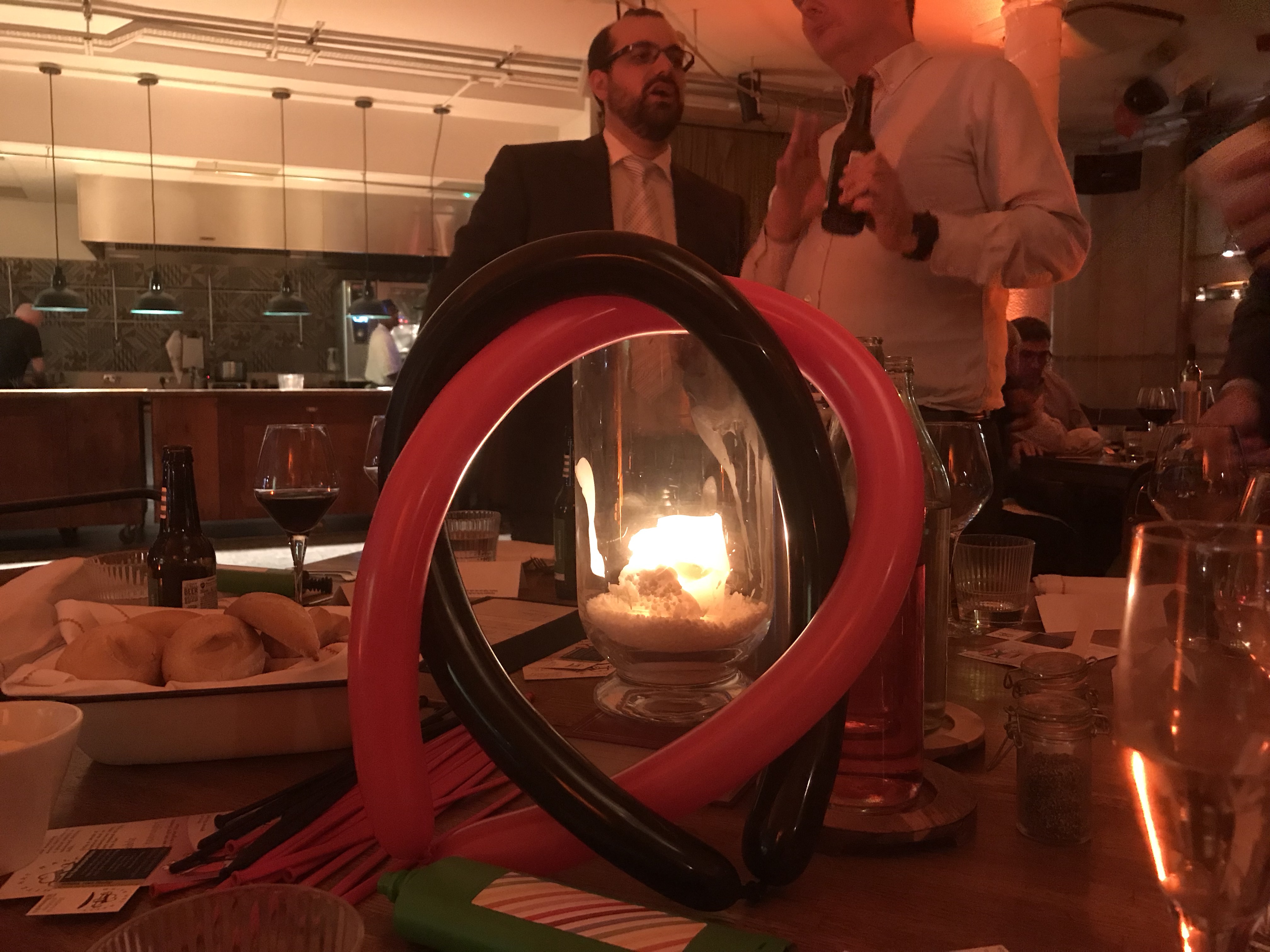 There were balloons on the table and a challenge to make the Crest logo from them. This was R and my’s attempt.