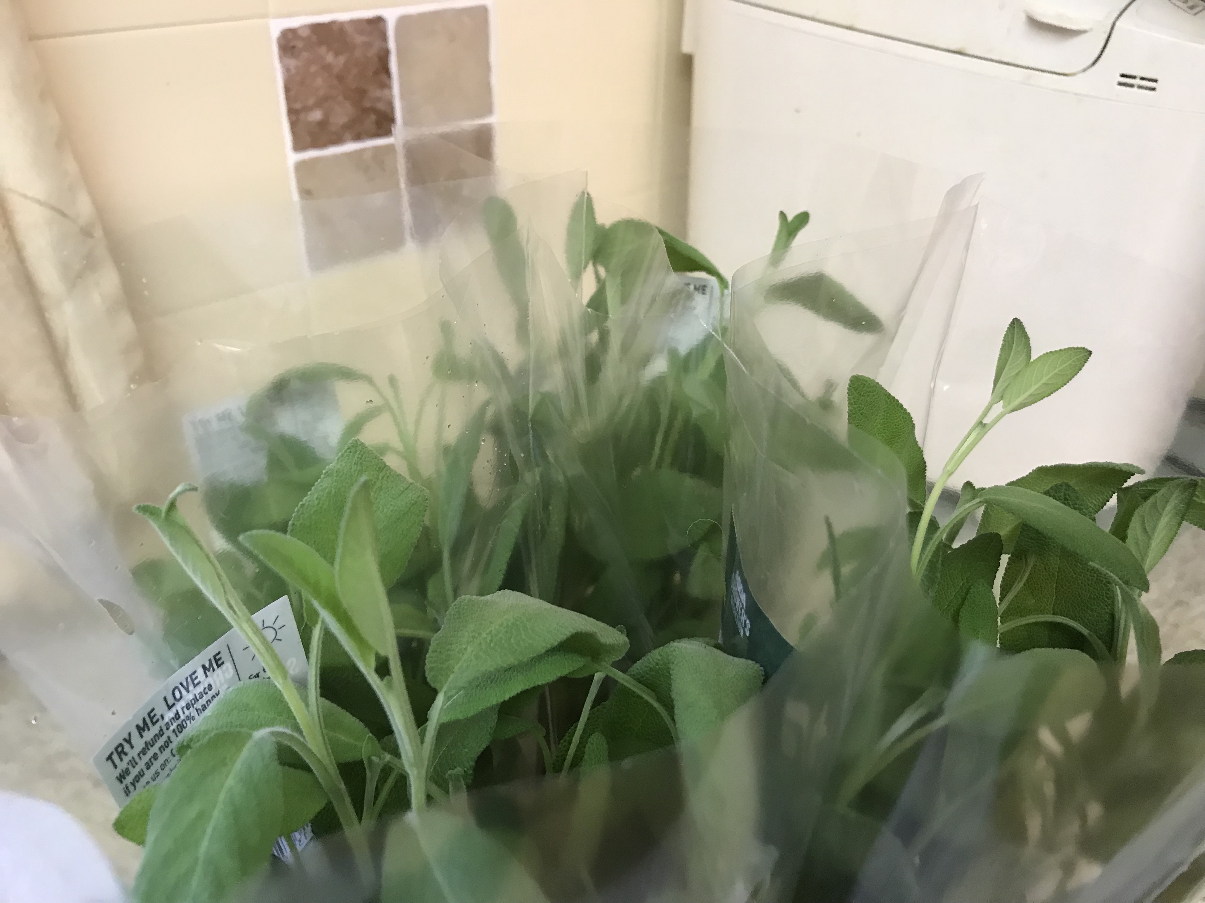 Even more verdant is the sage that turned up with my ASDA delivery today – I had ordered four packets of leaves but they have turned up as four live plants.