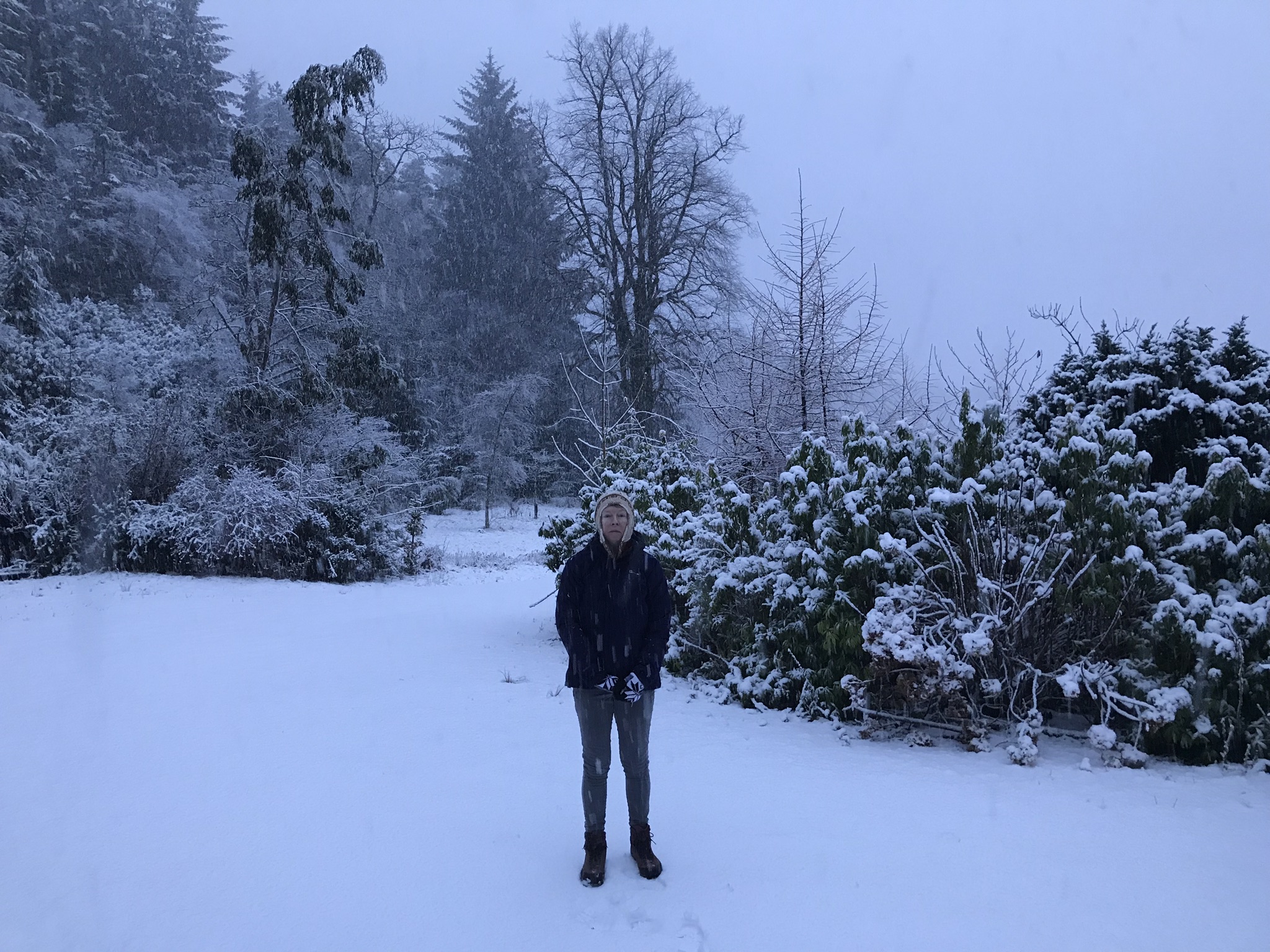 Woke up this morning on R’s birthday to heavy snow. We went out and labouriously cleared the 72m driveway – although I will be surprised if we get any deliveries today. The cats assisted us by running up and down complaining loudly. Here is me in the Lama hat which N and J brought me from Peru.