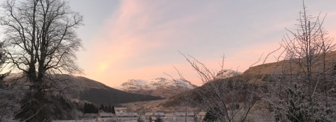 The view over Beinn Bheula as the sun is coming up is quite spectacular as it slowly turns from white to pink. Particularly nice today as there is a clear half moon hanging over the mountain.