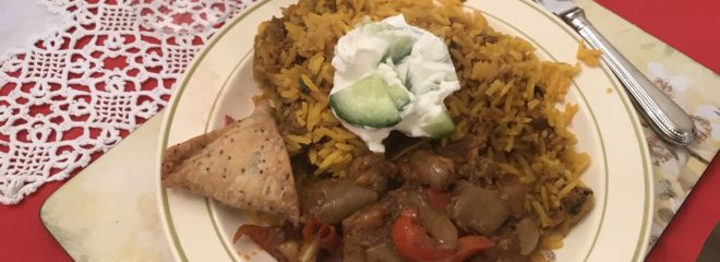 So on Thursday and Friday I prepared a south Asian version (Nadiya’s version from Bangladesh) – made with lamb rather than goat as they don’t sell the latter in ASDA Dumbarton. I also made tarka dal, a super hot cauliflower and potato curry, naan breads and some raita. I’d been going to make samosas and onion bhajis as well but I ran out of time and ended up buying them.