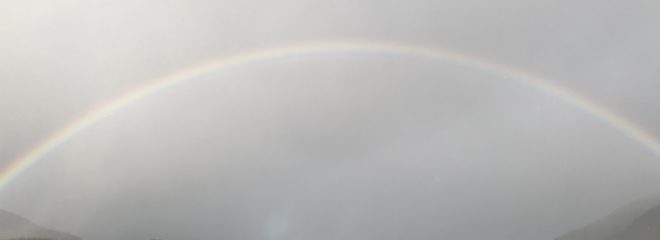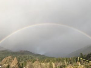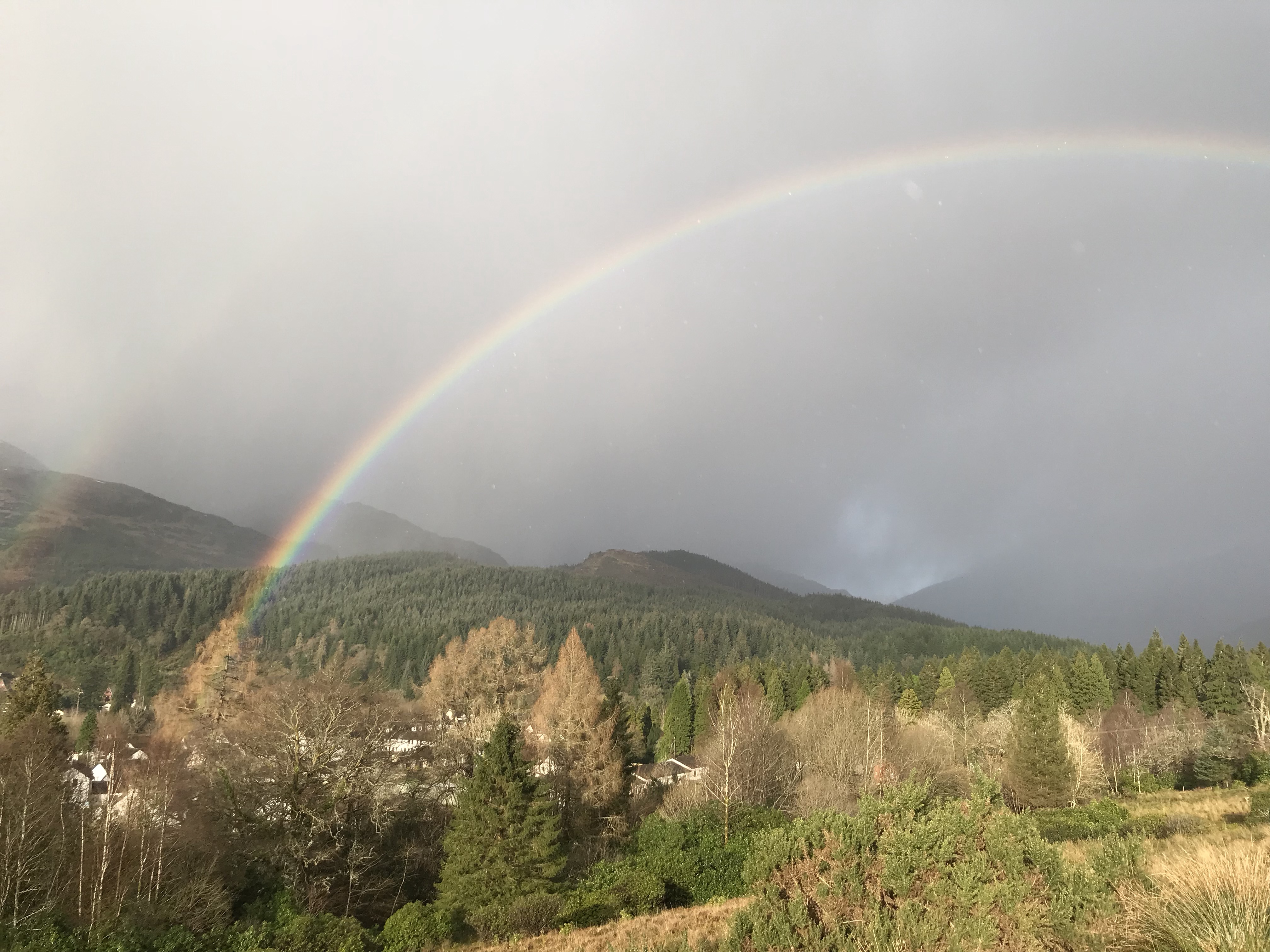 We had a sprinkling of snow overnight yesterday and when we went for our walk there was a fantastic rainbow. It was actually not only a double but a triple bow – but I don’t think the triple part shows up in the photos.