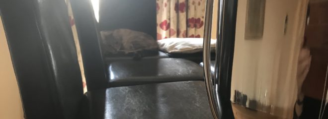 I don’t have a suitable photo for this, but the one shown is of Tora sleeping on a chair I had placed on top of the the table to get it out of the way of the new cleaning robot. It seemed a favourite location as a few hours later his brother had relocated up there as well. It may just be that they are trying to avoid each other as with the cold weather they are a bit fractious.