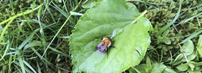 So in true “creature rescue” mode – I made a strong solution of sugar and dripped it on a leaf. Then I carefully transferred the bee to it. Almost immediately she put out her long proboscis and started drinking down the sugar water. She sat there drinking for about five minutes, and then when I picked the leaf up – she flew off.