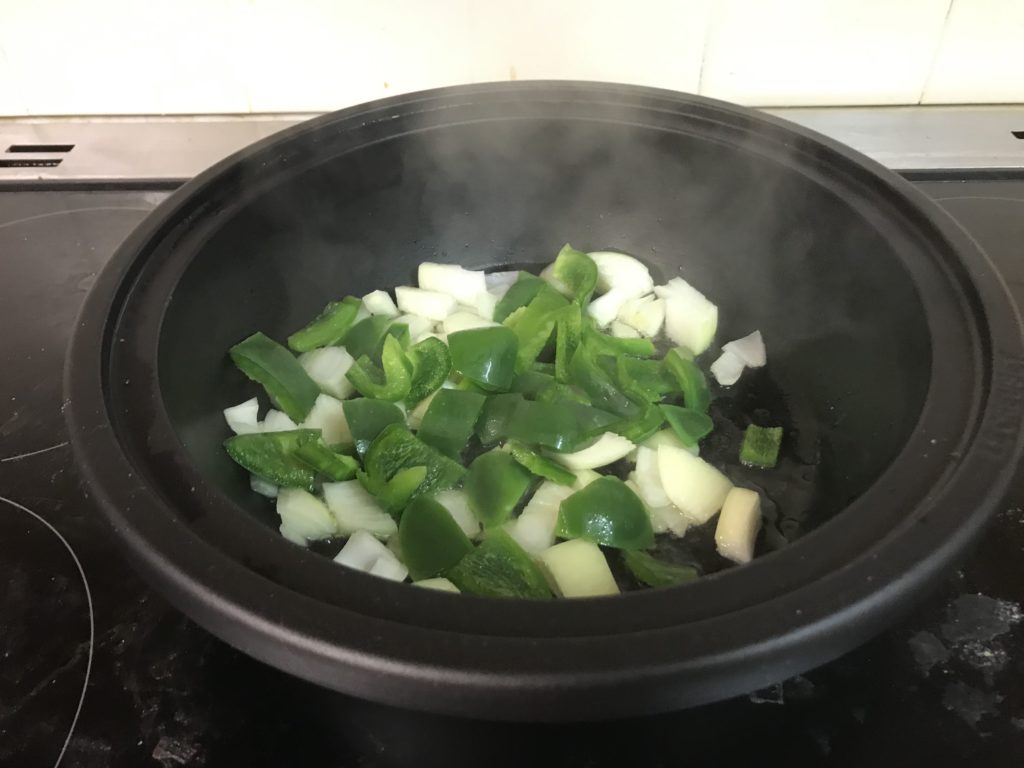 Fried off an onion with peppers, a chili (no seeds as R doesn’t like it hot)
