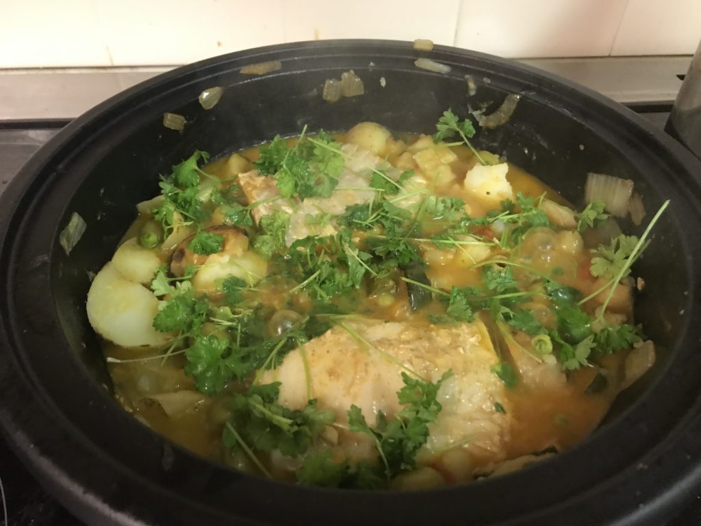 I made a traditional fish tagine stew using cod loin fillet. This is the tagine pot itself. The idea is that the narrow spout reduces evaporation during slow cooking and concentrates flavour whilst tenderizing the contents of the stew.