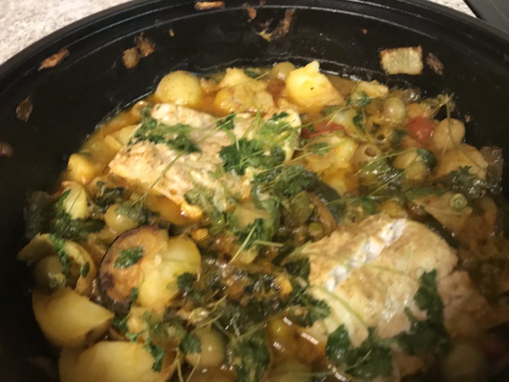Add everything to the Tagine with the fish in its marinade and some pre-steamed new potatoes