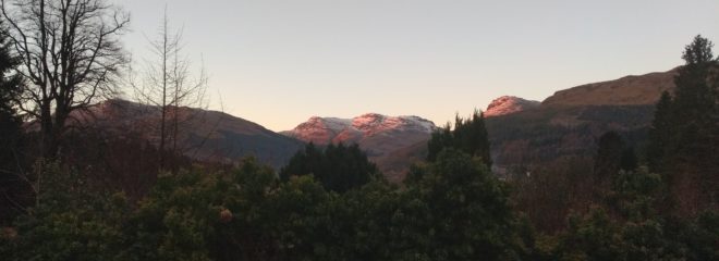 Very unusually we have had no snow on the mountains at all this year so far. This bodes ill because very mild dreich winters tend to lead to midge infestations in summer the following year. But today for only the second time this year it was below freezing and there was quite a bit of snow on Beinn Bheula.