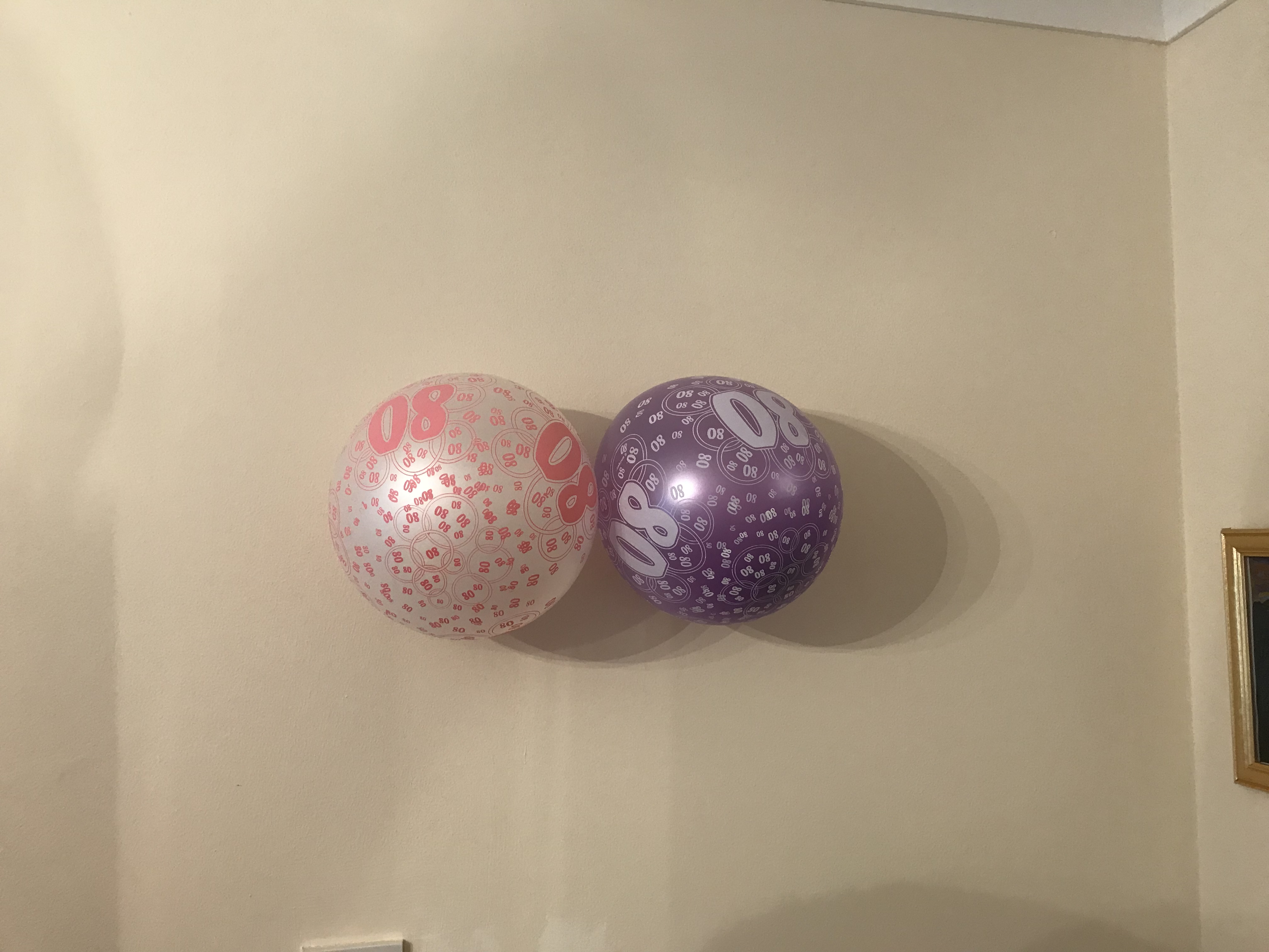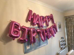 Salmon sandwiches, egg and cress sandwiches, selection of seafood, sausage rolls, rice salad etc. I have to say that if my Mum’s favourite meal is fish and chips, this particular buffet selection is my favourite (although definitely not R’s). We also had a fantastic birthday cake – if I weren’t grateful to Mary Berry for all her other recipes and TV programs already, I would have to specially thank her for her black forest gateau which I have made on numerous occasions (although I do substitute raspberries for the cherries). J much to his dislike had to deal with some special balloons.