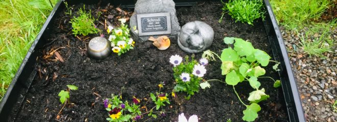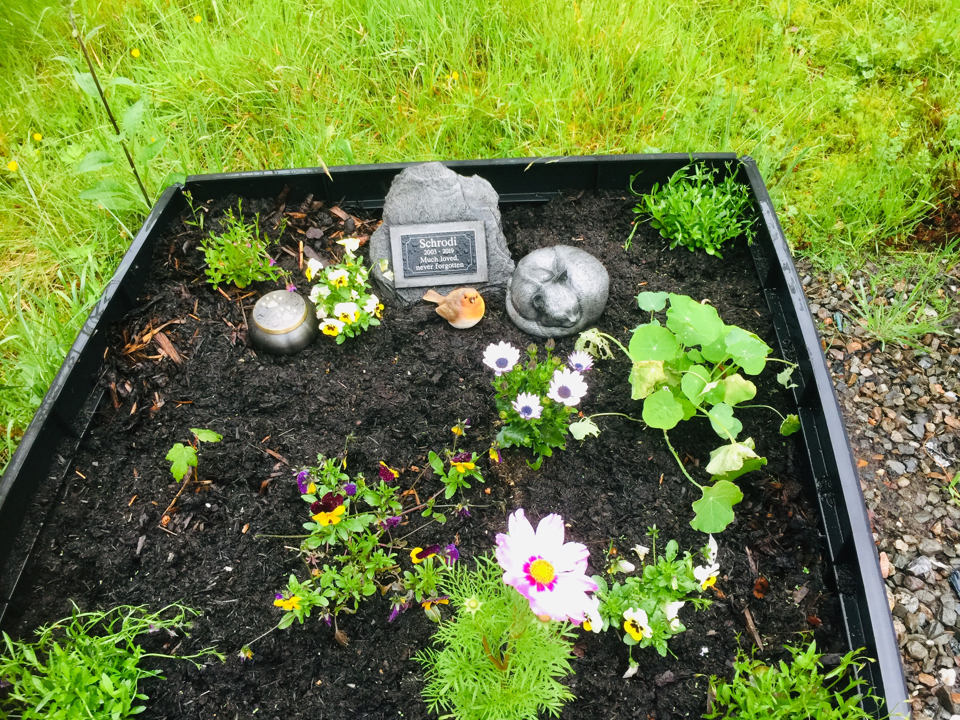 Schrodi’s little garden of remembrance got a new addition when my Mum bought a wee Robin for it. I am sure Schrodi in life would have liked this, although I don’t think the Robin would really have appreciated him!