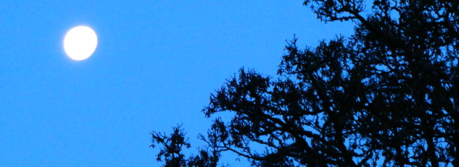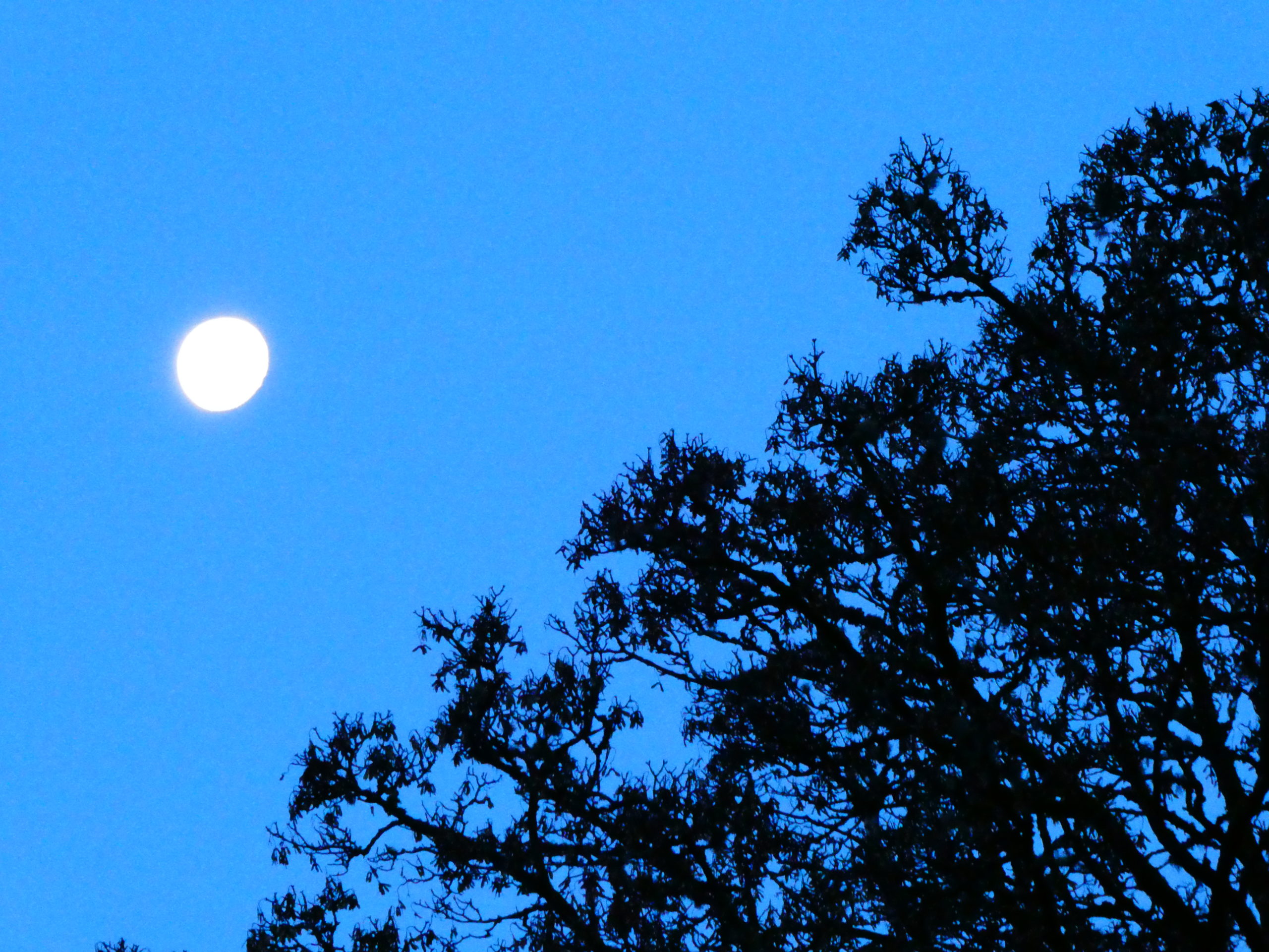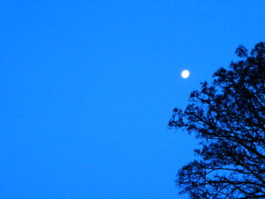 The weather here is still fantastic. R and I went out just the back of 7:30 this morning, and the moon was still hanging in the sky over the trees like a balloon or a big silver plate.