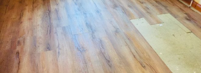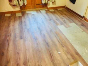 Then I cleaned the floor and laid all the boards out to test how they could fit. This was a big job as the packs weigh 20Kg. Got all that done and then started to spread the adhesive to secure them to the floor. My God, that adhesive is evil stuff. It is not easy to spread and if you get it on your hands it just won’t come off. In spite of wearing rubber gloves (which got sticky themselves), I managed to get some on my hands. I had to go and look up how to remove it on the Internet and discovered that the best methods were acetone (as in nail varnish remover) or vinegar. Not having the former, I had to try the latter and I will say that it largely removed the sticky, although it has left me smelling like a fish supper.