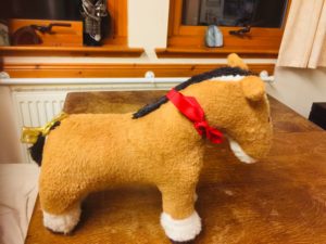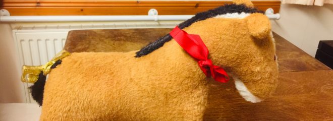 The picture is of Dobbin. He was my push on horse when I was a child, but some time in the late 70s he started to deteriorate after much love with his stitching coming undone. Also my brother in his wisdom decided to remove his wheels, so he was left with struts of metal protruding from his feet and could no longer stand up.
