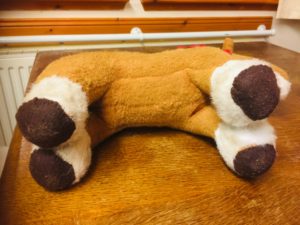 I was left with the problem of his feet. First of all I tried to unscrew the protruding pieces of metal but they wouldn’t turn and on further investigation, they turned out to be part of a solid metal rod running all the way up his leg. So then I tried a hacksaw. They really knew how to make things in those days because my saw wouldn’t even scratch them. I then had a further idea. I took some felt, and sewed it most of the way round the foot. I then carefully packed it with Kapok and pressed it in hard, so he effectively has four new feet and is 1cm taller than he was before.