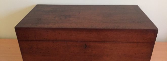 Since I was a child I have loved an old Deed box which has been in the family for ages. I don’t know how old it is, but I would guess at least 150 years. My Mum gave it to me recently and it was in dire need of repair – there were water marks all over the lid, the varnish was all faded and there were bits of the surface veneer missing in multiple places.
