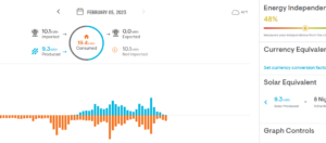 Another thing to bear in mind is that 9kwh is actually around the full (i.e. 100%) daily energy consumption for an average UK household – we are much higher because we use electricity for cooking, heating/cooling our offices and powering large numbers of computers. At a push we could survive on 9kwh for lighting, devices and cooking (using the microwave and induction hob rather than the electric oven)